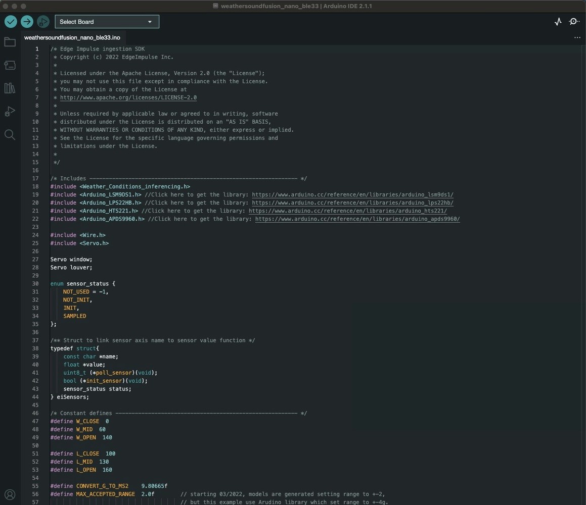 Now download the .ino code here https://github.com/Jallson/SensorFusion_SmartBuilding/blob/main/weathersoundfusion_nano_ble33.ino.