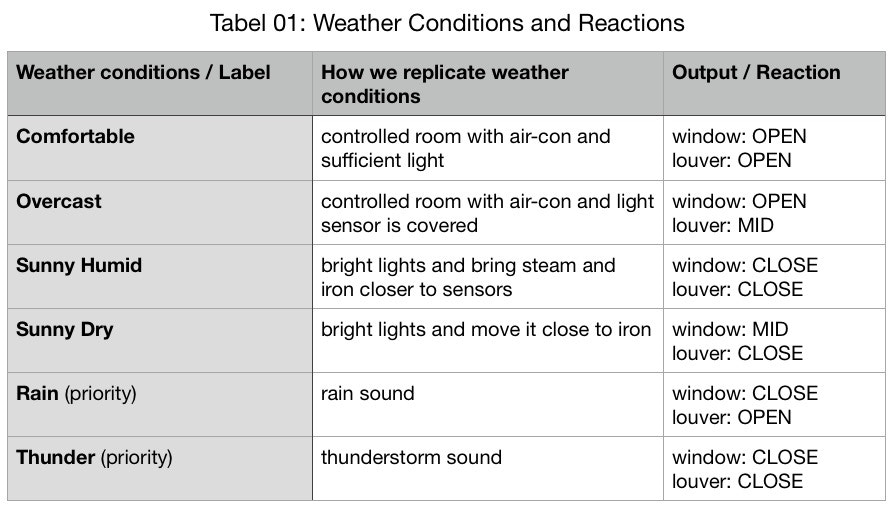 Louver / blinds and windows that can adjust opening angles based on rain and thunderstorm sounds, combined with environmental conditions (light intensity, humidity, and temperature) by using two machine learning models in separate MCUs. One device performs sound classification, and the other one performs sensor fusion of environmental conditions.