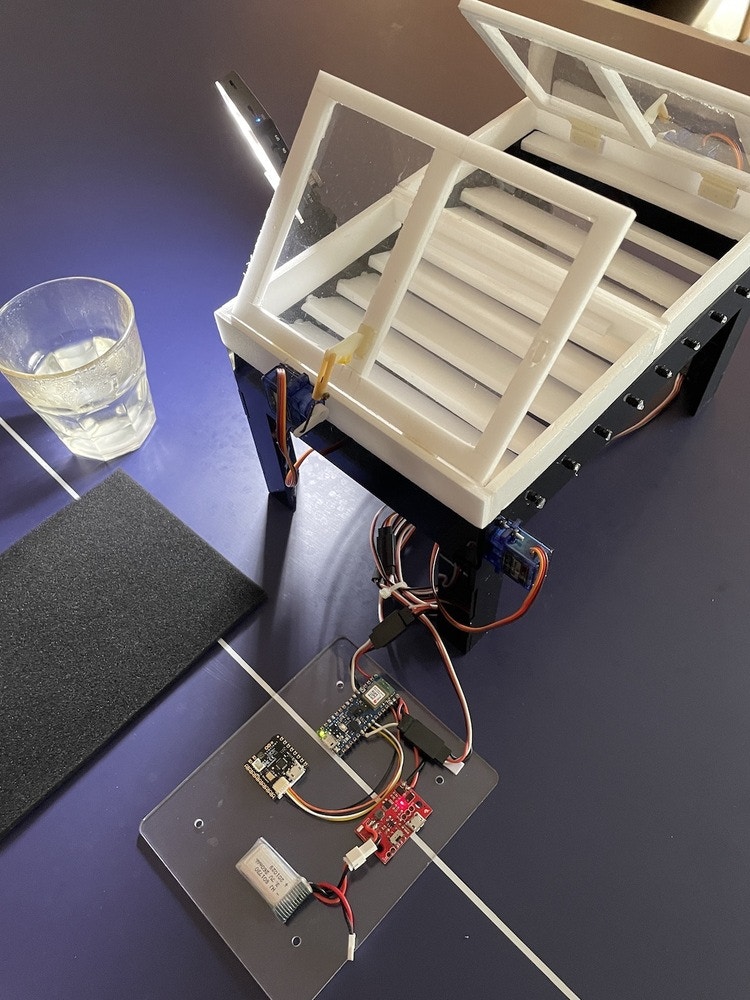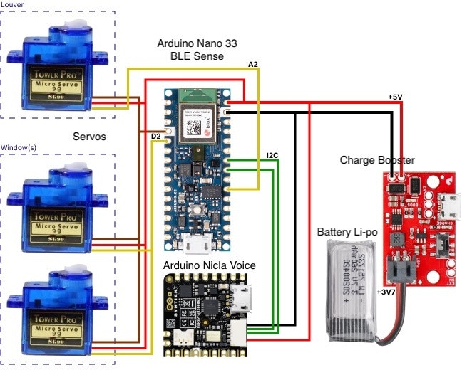 This project takes advantage of machine learning (ML) to differentiate sounds, and also distinguish weather conditions with a combination of temperature, humidity, and brightness. Acquiring data and building a model can be done directly in the Edge Impulse Studio. The sound data will include variations of rain, thunderstorms, as well as unknown sounds; horns, cars passing by, and the sounds of people, etc. Whereas in environmental conditions the data will be directly in the form of a combination of temperature, humidity, light in sunny dry, sunny humid, comfortable, and overcast conditions. The result of these two kinds of ML models will be embedded in separate MCUs (Arduino Nicla Voice & Arduino Nano 33 BLE Sense) and will be combined into a customized program to control the opening angle of the window and louver, so that energy efficiency and comfort in room conditions can be achieved optimally and automatically. This project is a Proof of Concept (PoC) miniature model using acrylic and a styrofoam canopy, with window and louver movement controlled with angle servos. The sensors (temp, humidity, light, and sound) are already contained on the Arduino boards, so it can read the current realistic situation without adding any more specific sensors.Hardware Components: