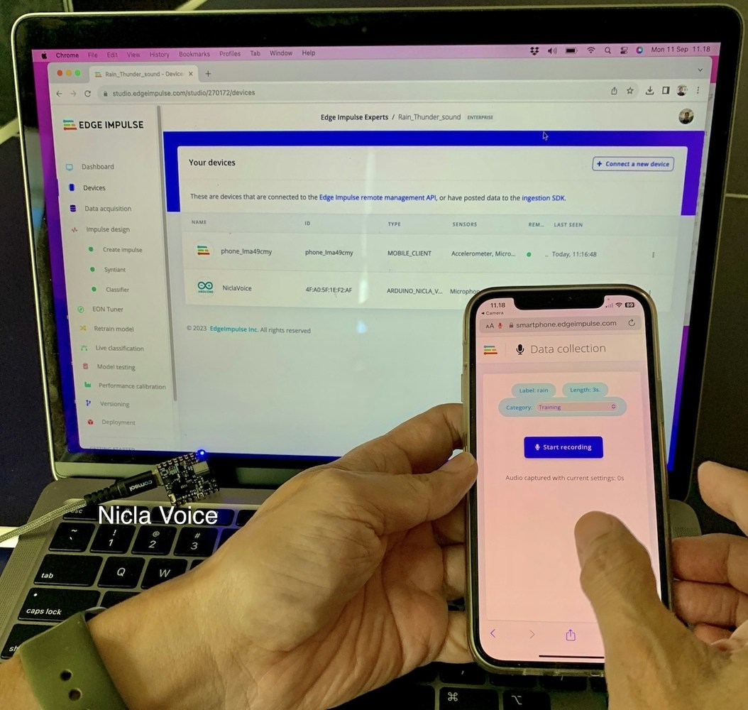 Before we start, we need to install the Arduino CLI and Edge Impulse tooling on our computer. You can follow this guide to get everything installed. Open studio.edgeimpulse.com in a browser, and sign in, or create a new account if you do not have one. Click on New project, then in Data acquisition, click on the Upload Data icon for uploading.wav files (e.g. from Pixabay, Mixkit, Zapsplat, etc.). Other methods to collect data are from devices such as a connected smartphone with QR code link, or a connected Nicla Vision with Edge Impulse audio firmware flashed to it. For ease of labelling, when collecting and uploading data, fill in the name according to the desired label, for example rain, thunder, or z_unknown for your background noise data.