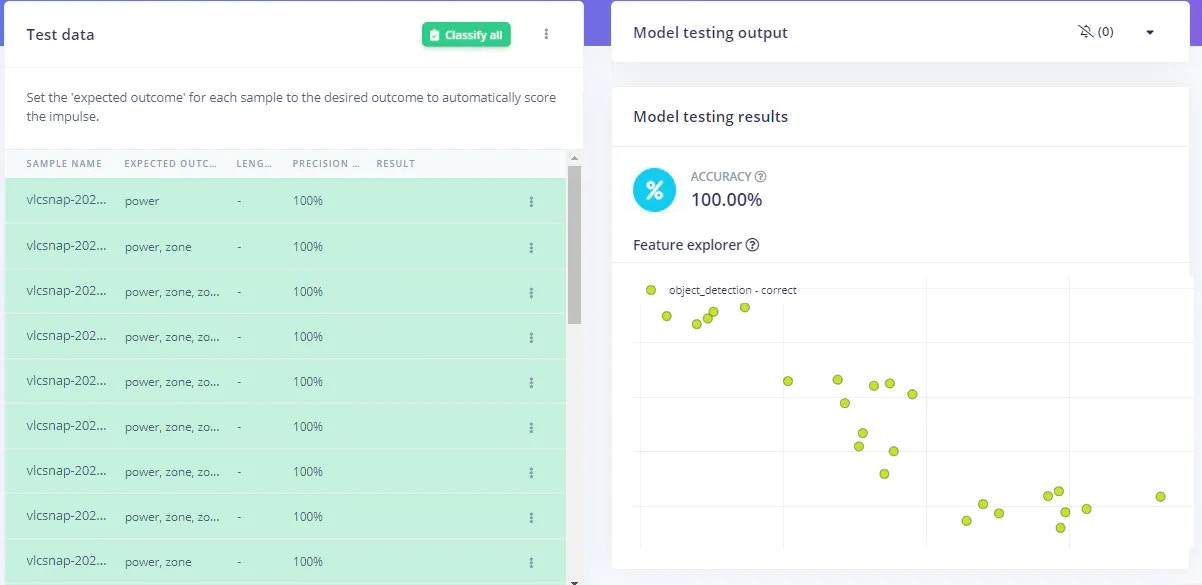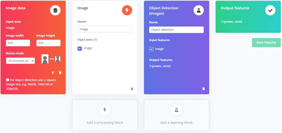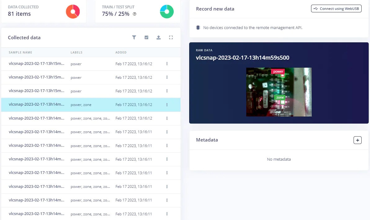 Video > Take Snapshot to take a screenshot of my controller. I would use my smartphone to change the temperature in various zones, which would cause those zone lights to illuminate red on the controller board. I took about a hundred photos with various lights illuminated (and off). Ideally you would have several hundred images but this was a good start. Once I had those images collected, it was time to start up the Edge Impulse Studio and start labelling data. I elected to do an object detection model since I wanted to identify the number of zones illuminated (and hence on), so labelling consisted of created bounding boxes around the illuminated zones (and power LED).