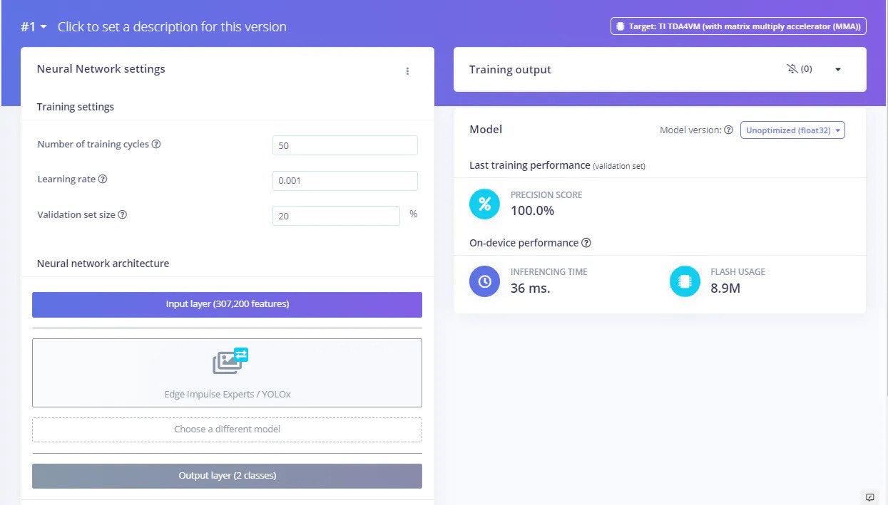 I initially selected a YoloV5 model as the model block for my transfer learning model, but I soon found out after deploying it that it wasn’t compatible with the TI Deep Learning (TIDL) AI accelerators. Thanks to the Edge Impulse team, I learned that I needed to use a TI fork of the YoloX model that would play nice with the TIDL framework. This tutorial took me a bit to complete as your system needs to be configured for Virtualization (which mine wasn’t) and Docker desktop needs to be installed. It took a couple nights of trying, but I was finally able to push my custom YoloX block to the project. Once I had that custom block created, I retrained my model with YoloX: