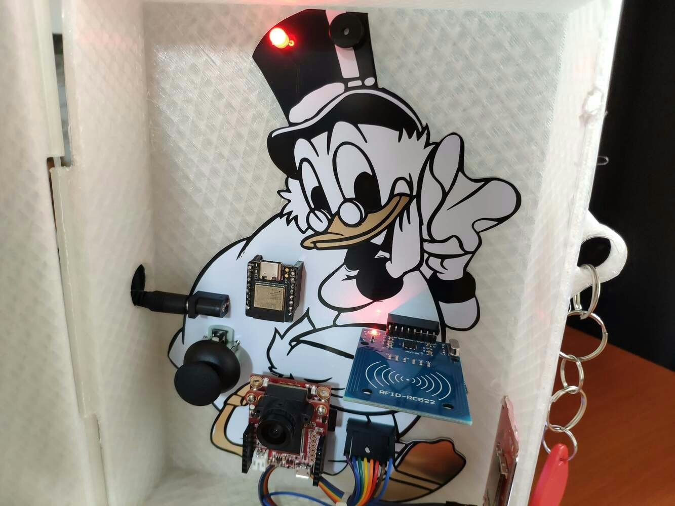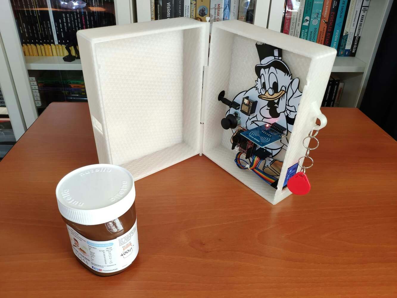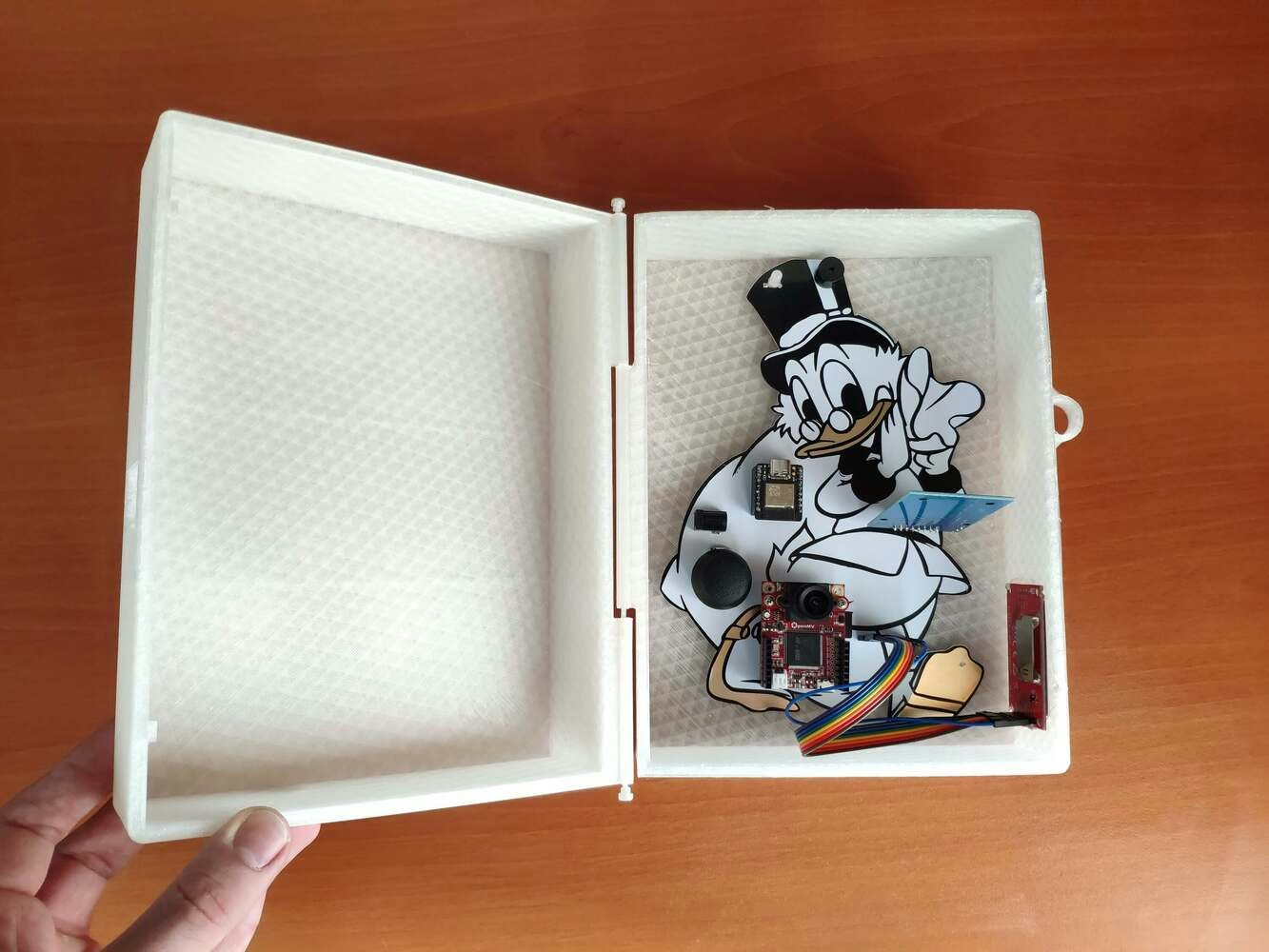 After printing all parts (models), I placed the pin through the hinges on the top and bottom parts and fixed the pin via the pin ends (caps). I affixed the Scrooge McDuck PCB to the bottom part of the hinged case via a hot glue gun. Then, I attached the ST7735 TFT display to the hinged case via its slot on the bottom part to make customers see the screen even if the hinged case is closed via its built-in snap-fit joints.