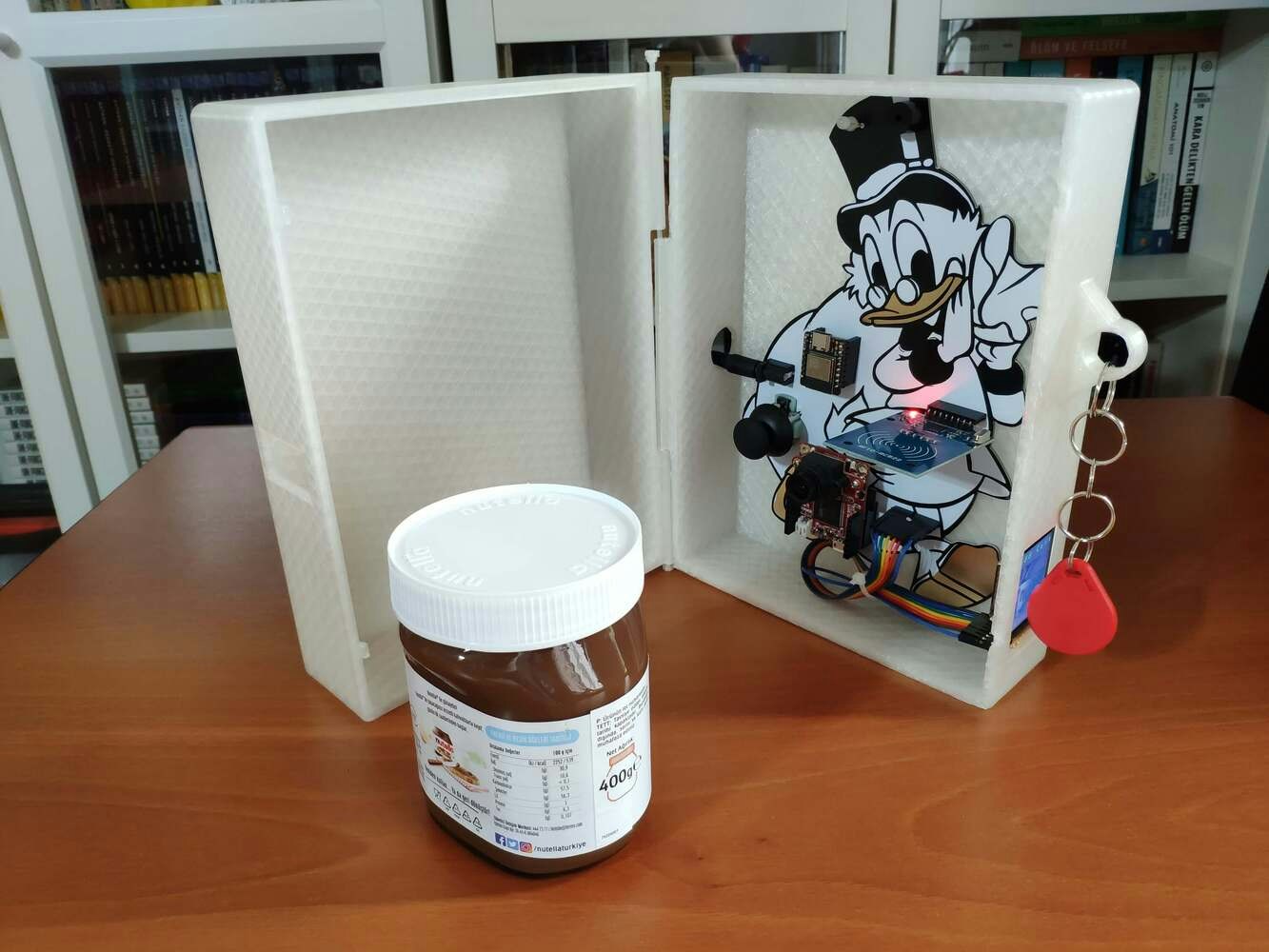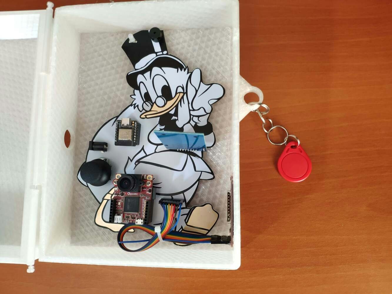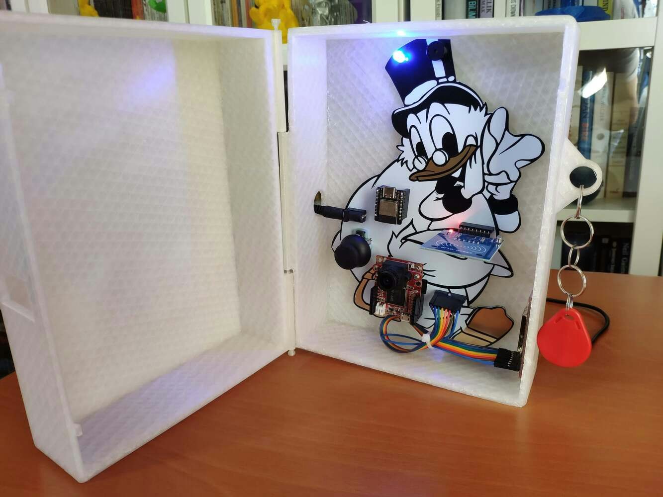 After printing all parts (models), I placed the pin through the hinges on the top and bottom parts and fixed the pin via the pin ends (caps). I affixed the Scrooge McDuck PCB to the bottom part of the hinged case via a hot glue gun. Then, I attached the ST7735 TFT display to the hinged case via its slot on the bottom part to make customers see the screen even if the hinged case is closed via its built-in snap-fit joints.