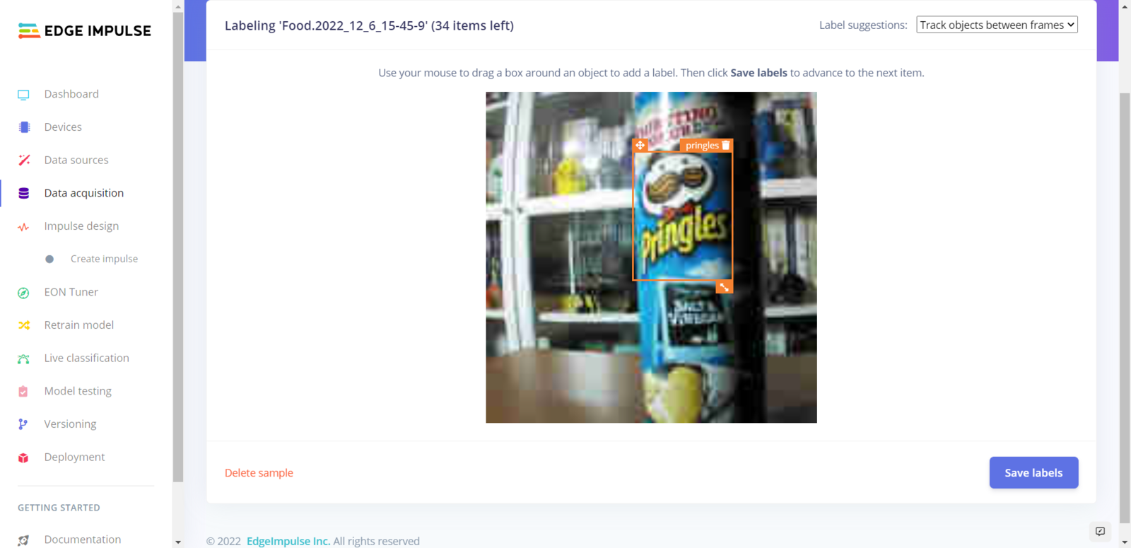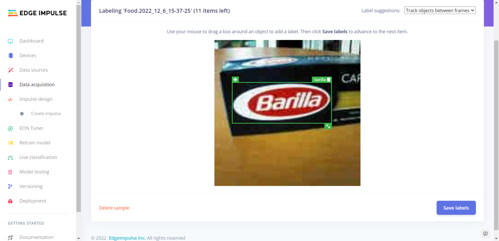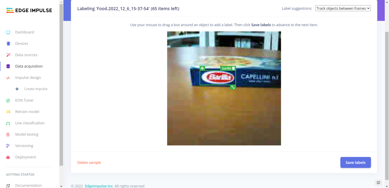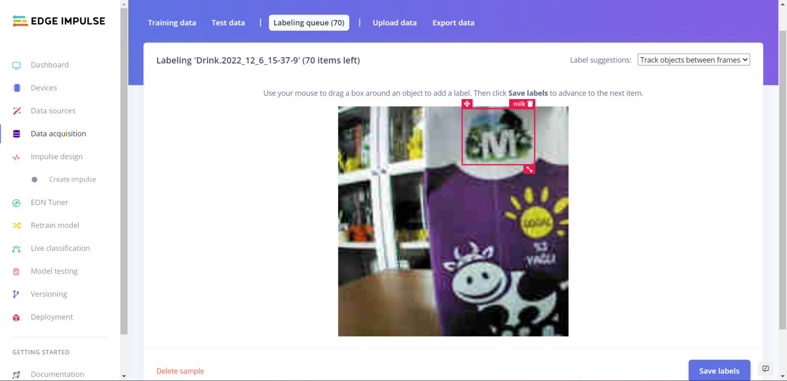 After collecting training and testing image samples, I uploaded them to my project on Edge Impulse. Then, I utilized the product brand names to label each sample. :hash: First of all, sign up for Edge Impulse and create a new project.