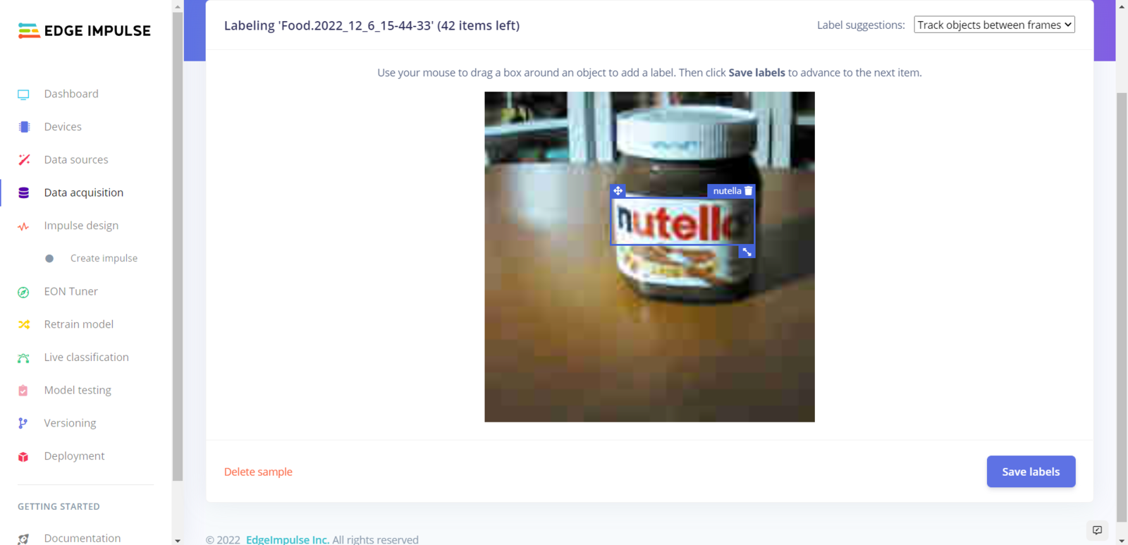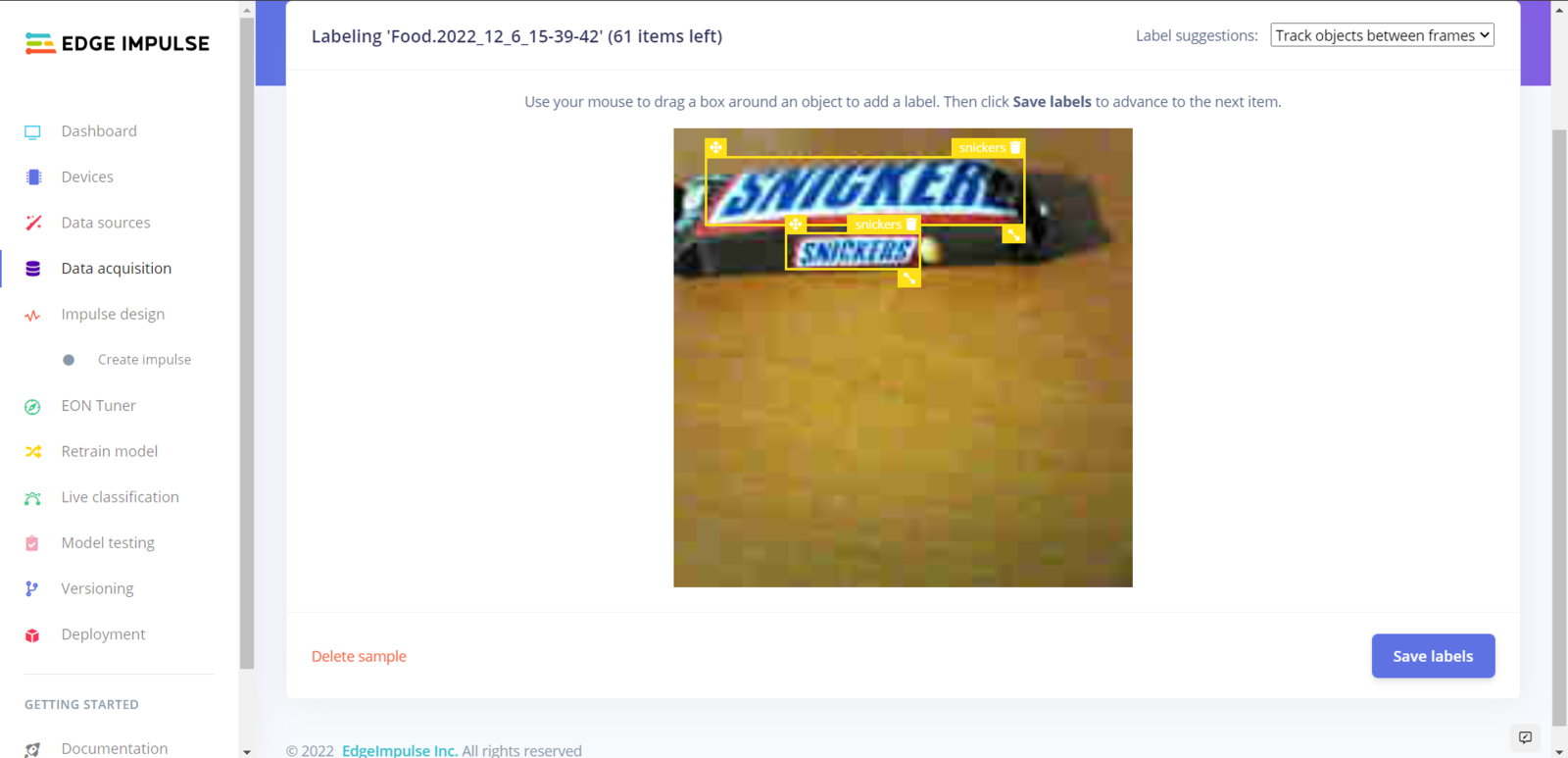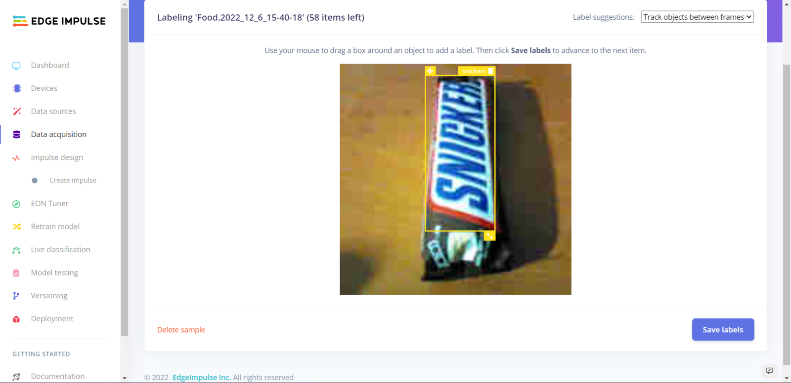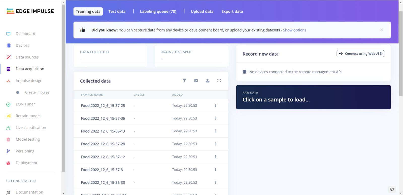 After collecting training and testing image samples, I uploaded them to my project on Edge Impulse. Then, I utilized the product brand names to label each sample. :hash: First of all, sign up for Edge Impulse and create a new project.