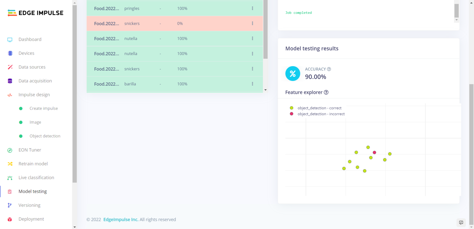 After building and training my object detection model, I tested its accuracy and validity by utilizing testing image samples. The evaluated accuracy of the model is 90%. :hash: To validate the trained model, go to the Model testing page and click Classify all.