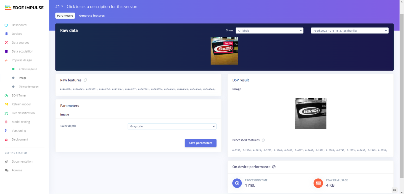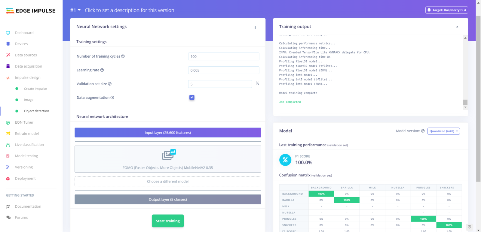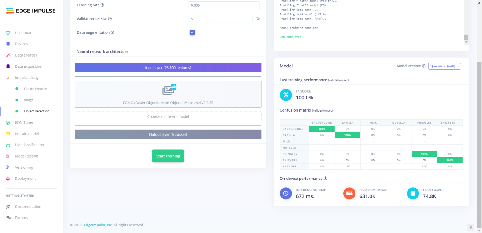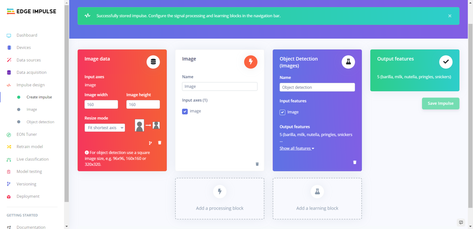 After labeling my training and testing samples successfully, I designed an impulse and trained it on detecting a small group of food retail products. An impulse is a custom neural network model in Edge Impulse. I created my impulse by employing the Image preprocessing block and the Object Detection (Images) learning block. The Image preprocessing block optionally turns the input image format to grayscale and generates a features array from the raw image. The Object Detection (Images) learning block represents a machine learning algorithm that detects objects on the given image, distinguished between model labels. :hash: Go to the Create impulse page and set image width and height parameters to 160. Then, select the resize mode parameter as Fit shortest axis so as to scale (resize) given training and testing image samples. :hash: Select the Image preprocessing block and the Object Detection (Images) learning block. Finally, click Save Impulse.