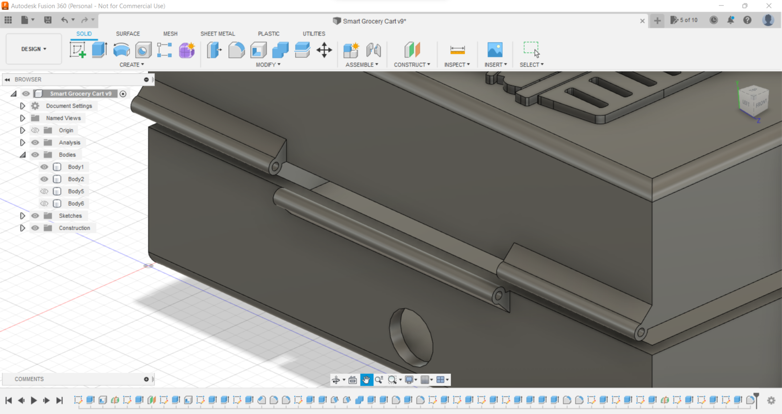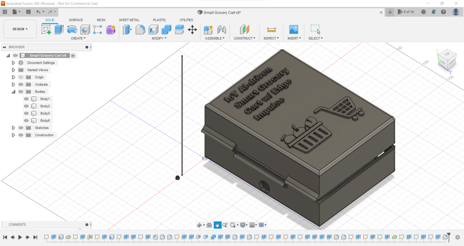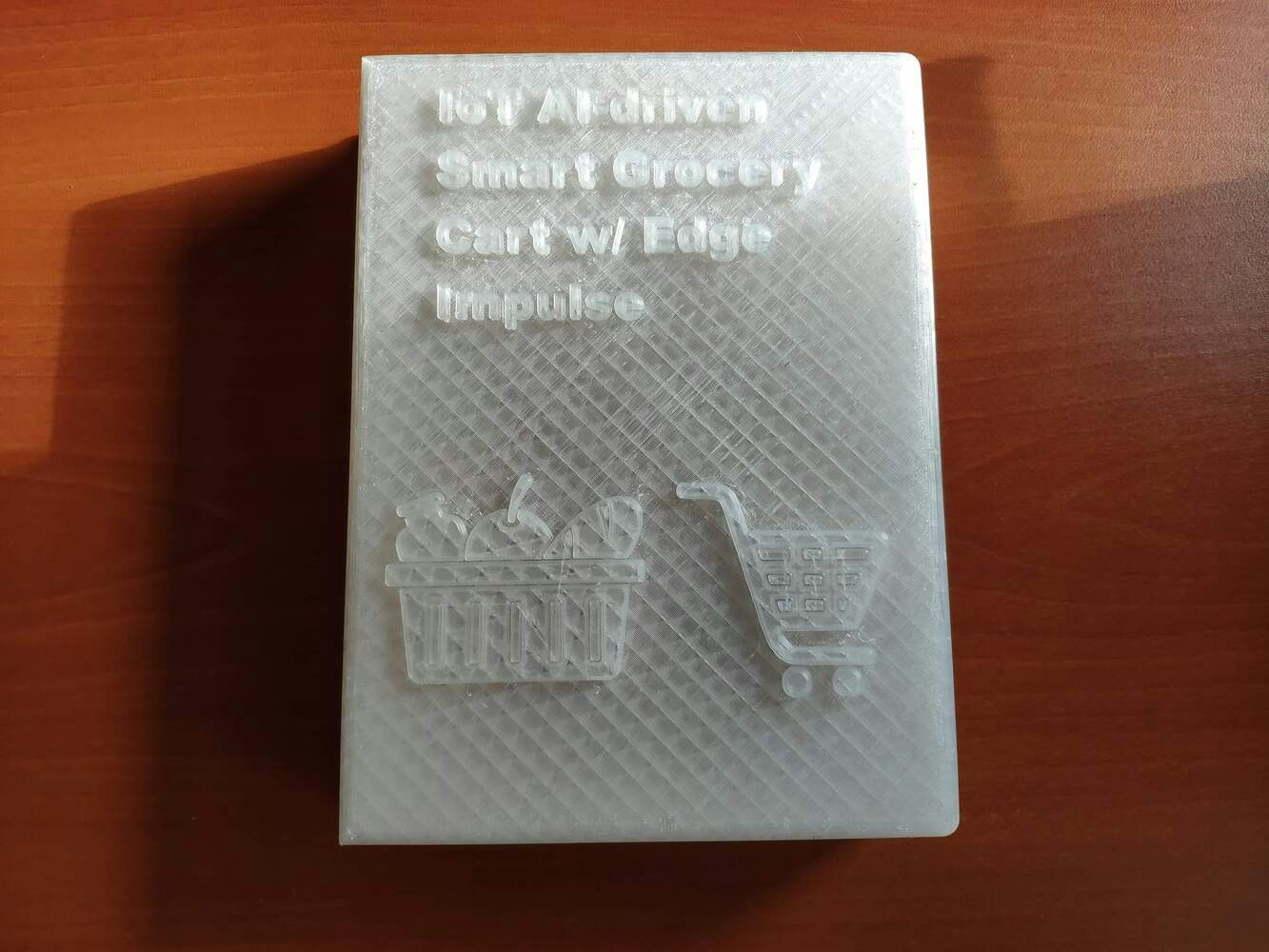 Since I focused on building a budget-friendly and easy-to-use device that captures food retail product images, detects products with object detection, and provides an exceptional customer experience, I decided to design a robust and sturdy semi-transparent hinged case allowing the customer to access the RFID reader and the joystick effortlessly. To avoid overexposure to dust and prevent loose wire connections, I added two snap-fit joints to the hinged case. Also, I decided to emboss different grocery cart icons on the top part of the hinged case to emphasize the shopping theme gloriously :) Since I needed to connect the top and bottom parts of the hinged case seamlessly, I designed a pin with pin ends (caps). To make the device compatible with any grocery cart, I added two hooks on the back of the bottom part. Also, I added a ring to the bottom part to attach the assigned RFID key tag. I designed the top and bottom parts of the hinged case, the pin, and the pin ends in Autodesk Fusion 360. You can download their STL files below.