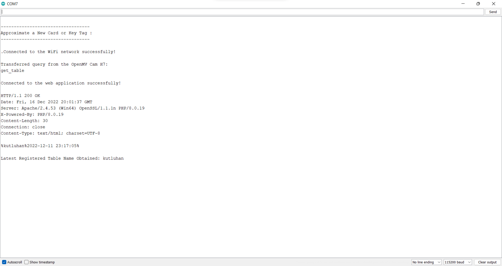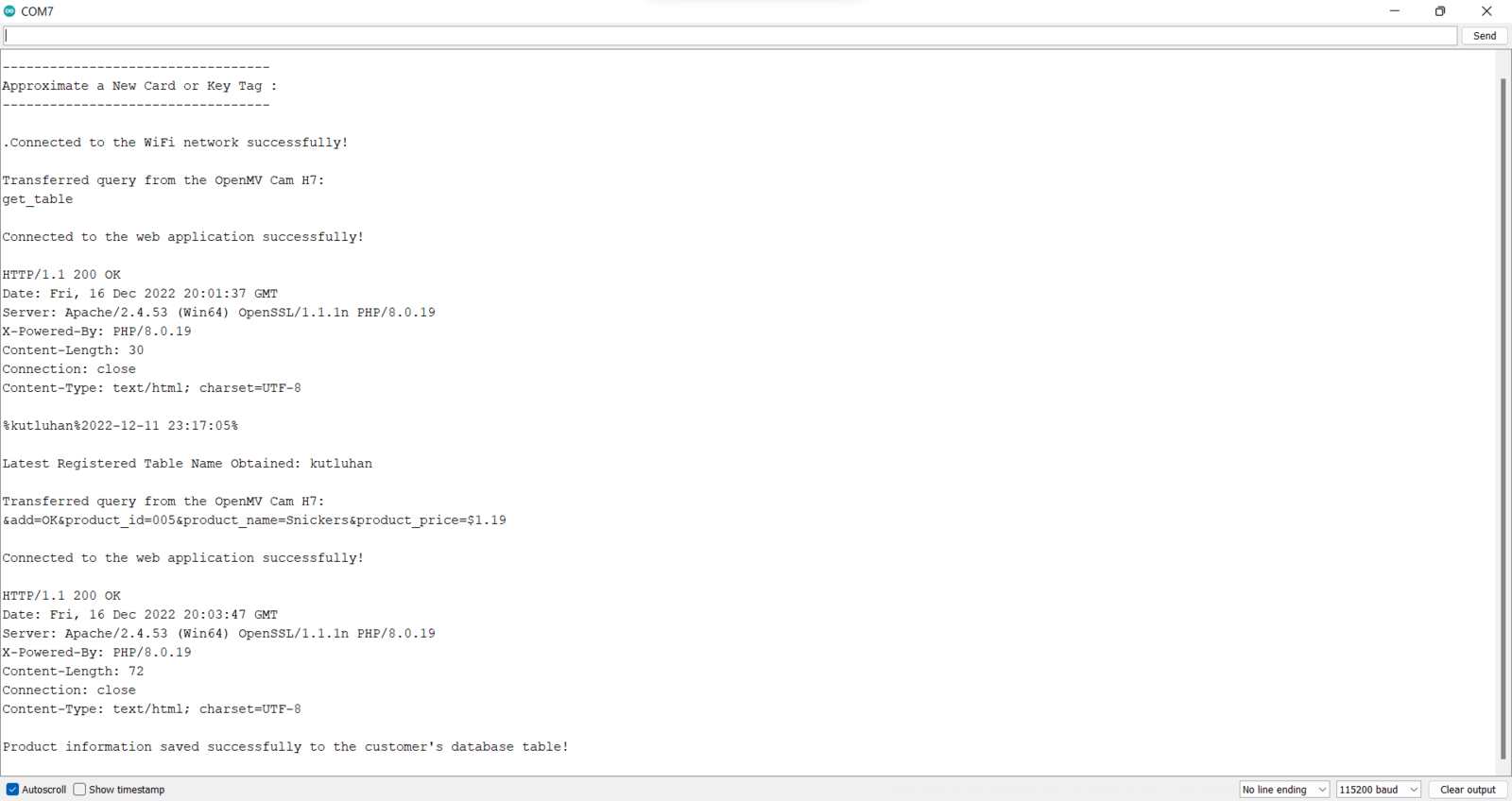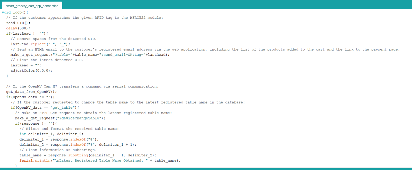 Since OpenMV Cam H7 does not provide Wi-Fi or cellular connectivity, I employed Beetle ESP32-C3 to get commands from OpenMV Cam H7 via serial communication and communicate with the web application via HTTP GET requests. Also, Beetle ESP32-C3 determines when the customer concludes shopping and is ready to leave the store if it detects the assigned RFID key tag UID of the grocery cart via the MFRC522 RFID reader. You can download the smart_grocery_cart_app_connection.ino file to try and inspect the code for obtaining commands from OpenMV Cam H7 via serial communication and communicating with the web application. β Include the required libraries.