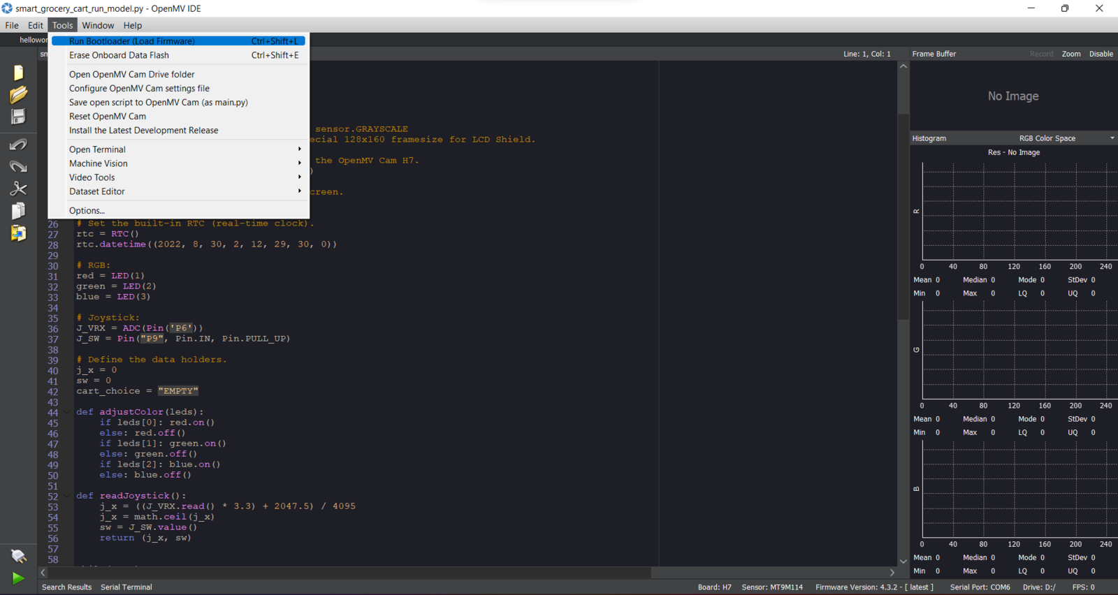 After building, training, and deploying my object detection (FOMO) model as an OpenMV firmware on Edge Impulse, I needed to flash OpenMV Cam H7 with the generated firmware to run the model directly so as to create an easy-to-use and capable device operating with minimal latency, memory usage, and power consumption. FOMO object detection models do not output bounding boxes but provide the detected objectβs location using centroids. Therefore, I was able to modify the returned object location variables to draw circles around the detected objects on the ST7735 color TFT screen with the assigned circle color β magenta. Since Edge Impulse optimizes and formats preprocessing, configuration, and learning blocks into BIN files for each OpenMV version while deploying models as OpenMV firmware, I was able to flash OpenMV Cam H7 effortlessly to run inferences. :hash: After downloading the generated OpenMV firmware in the ZIP file format, plug OpenMV Cam H7 into your computer and open the OpenMV IDE. :hash: Then, go to Tools β‘ Run Bootloader (Load Firmware).