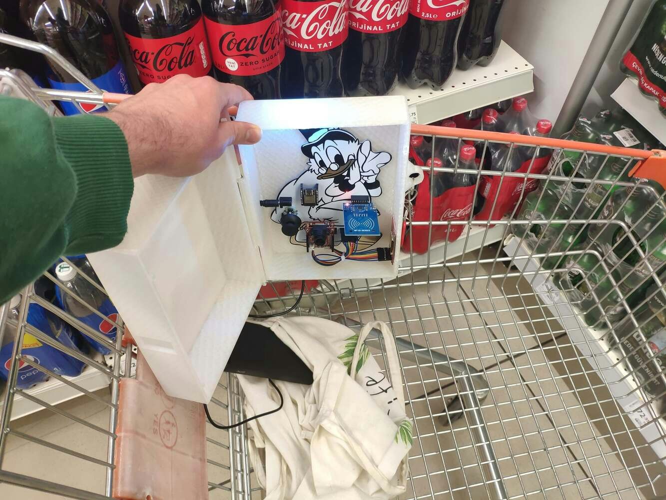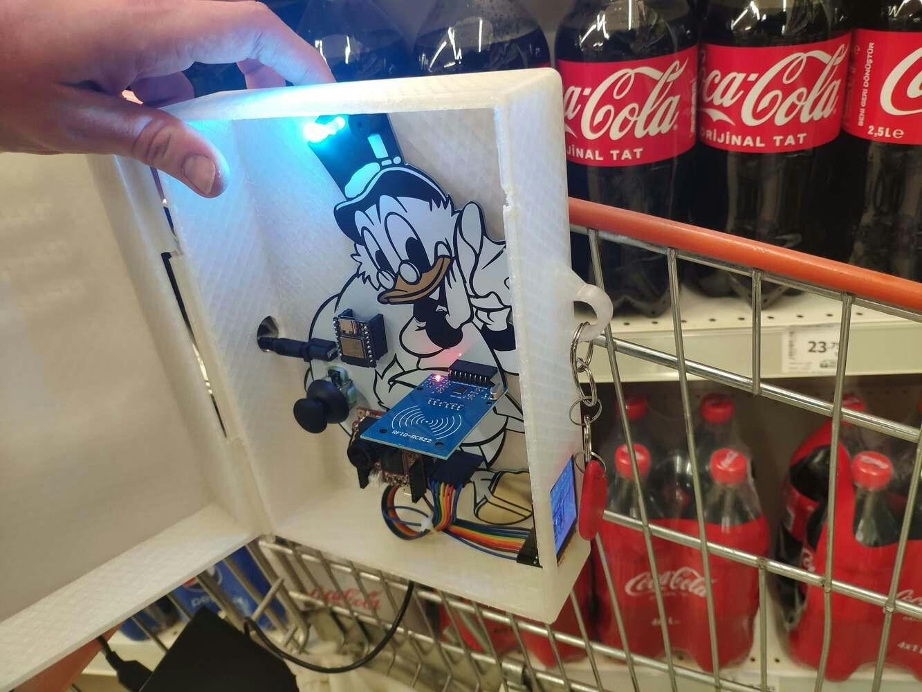 Especially after the recent success of Amazon Go cashierless convenience stores, there is a surge in adaptations of this relatively new approach to the shopping experience, including computer vision, sensor fusion, and deep learning. Since the nonpareil concept of cashierless stores is to make shoppers avoid tedious checkout lines and self-checkout stations, the stores equipped with this technology improve the customer experience and increase profit margins comparatively. While implementing this technology in a grocery or convenience store, smart grocery carts are the most prominent asset to provide an exceptional customer experience like Amazon Go. Although smart grocery carts improve the customer experience and plummet maintenance costs by providing an automated product tracking and payment system, the current integration methods are expensive investments for small businesses in the food retail industry since these methods require renovating (remodeling) store layouts or paying monthly fees to cloud services. After perusing recent research papers on smart grocery carts, I noticed there is no appliance devised for converting regular grocery carts into smart grocery carts without changing anything else in an existing establishment. Therefore, I decided to build a budget-friendly and easy-to-use device giving smart grocery cart perks to regular grocery carts with a user-friendly interface. To detect different food retail products accurately, I needed to create a valid data set in order to train my object detection model with notable veracity. Since OpenMV Cam H7 is a considerably small high-performance microcontroller board designed specifically for machine vision applications, I decided to utilize OpenMV Cam H7 in this project. Also, I was able to capture product images easily while collecting data and store them on an SD card since OpenMV Cam H7 has a built-in MicroSD card module. Then, I employed a color TFT screen (ST7735) to display a real-time video stream, the prediction (detection) results, and the selection (options) menu. After completing my data set including various food retail products, I built my object detection model with Edge Impulse to detect products added or removed to/from the grocery cart. I utilized Edge Impulse FOMO (Faster Objects, More Objects) algorithm to train my model, which is a novel machine learning algorithm that brings object detection to highly constrained devices. Since Edge Impulse is nearly compatible with all microcontrollers and development boards, I had not encountered any issues while uploading and running my model on OpenMV Cam H7. As labels, I utilized the product brand names, such as Nutella and Snickers. After training and testing my object detection (FOMO) model, I deployed and uploaded the model on OpenMV Cam H7 as an OpenMV firmware. Therefore, the device is capable of detecting products by running the model independently without any additional procedures or latency. Since I wanted to create a full-fledged device providing a wholesome shopping experience, I decided to build a web application from scratch in PHP, JavaScript, CSS, and MySQL. Therefore, I installed an Apache HTTP Server (XAMPP) on LattePanda 3 Delta, which also has a MariaDB database. This complementing web application lets customers create accounts via its interface, receives requests from the device to add or remove products to/from the customerβs database table, and creates a concurrent shopping list from the products added to the grocery cart. Also, the application sends an HTML email to the customerβs registered email address when the customer finishes shopping and is ready to leave the store, including the generated shopping list and the payment link. Since OpenMV Cam H7 does not provide Wi-Fi or cellular connectivity, I employed Beetle ESP32-C3 to get commands from OpenMV Cam H7 via serial communication and communicate with the web application via HTTP GET requests, which is an ultra-small size development board intended for IoT applications. To send commands via serial communication and control the selection menu after a product is detected by the model, I connected a joystick to OpenMV Cam H7. I also utilized the joystick while taking and storing pictures of various food retail products. To enable the device to determine when the customer completes shopping and is ready to leave the store, I connected an MFRC522 RFID reader to Beetle ESP32-C3 so as to detect the assigned RFID key tag provided by the store per grocery cart. Also, I connected a buzzer and an RGB LED to Beetle ESP32-C3 to inform the customer of the device status. After completing the wiring on a breadboard for the prototype and testing my code and object detection model, I decided to design a PCB for this project to make the device assembly effortless. Since Scrooge McDuck is one of my favorite cartoon characters and is famous for his wealth and stinginess, I thought it would be hilarious to design a shopping-related PCB based on him. Lastly, to make the device as robust and sturdy as possible while being attached to a grocery cart and utilized by customers, I designed a semi-transparent hinged case compatible with any grocery cart due to its hooks and snap-fit joints (3D printable). So, this is my project in a nutshell π In the following steps, you can find more detailed information on coding, capturing food retail product images, storing pictures on an SD card, building an object detection (FOMO) model with Edge Impulse, running the model on OpenMV Cam H7, developing a full-fledged web application, and communicating with the web application via Beetle ESP32-C3. ππ¨ Huge thanks to PCBWay for sponsoring this project. ππ¨ Huge thanks to DFRobot for sponsoring these products: β Beetle ESP32-C3 | Inspect β LattePanda 3 Delta 864 | Inspect β DFRobot 8.9β 1920x1200 IPS Touch Display | Inspect ππ¨ Also, huge thanks to Creality for sending me a Creality Sonic Pad, a Creality Sermoon V1 3D Print
