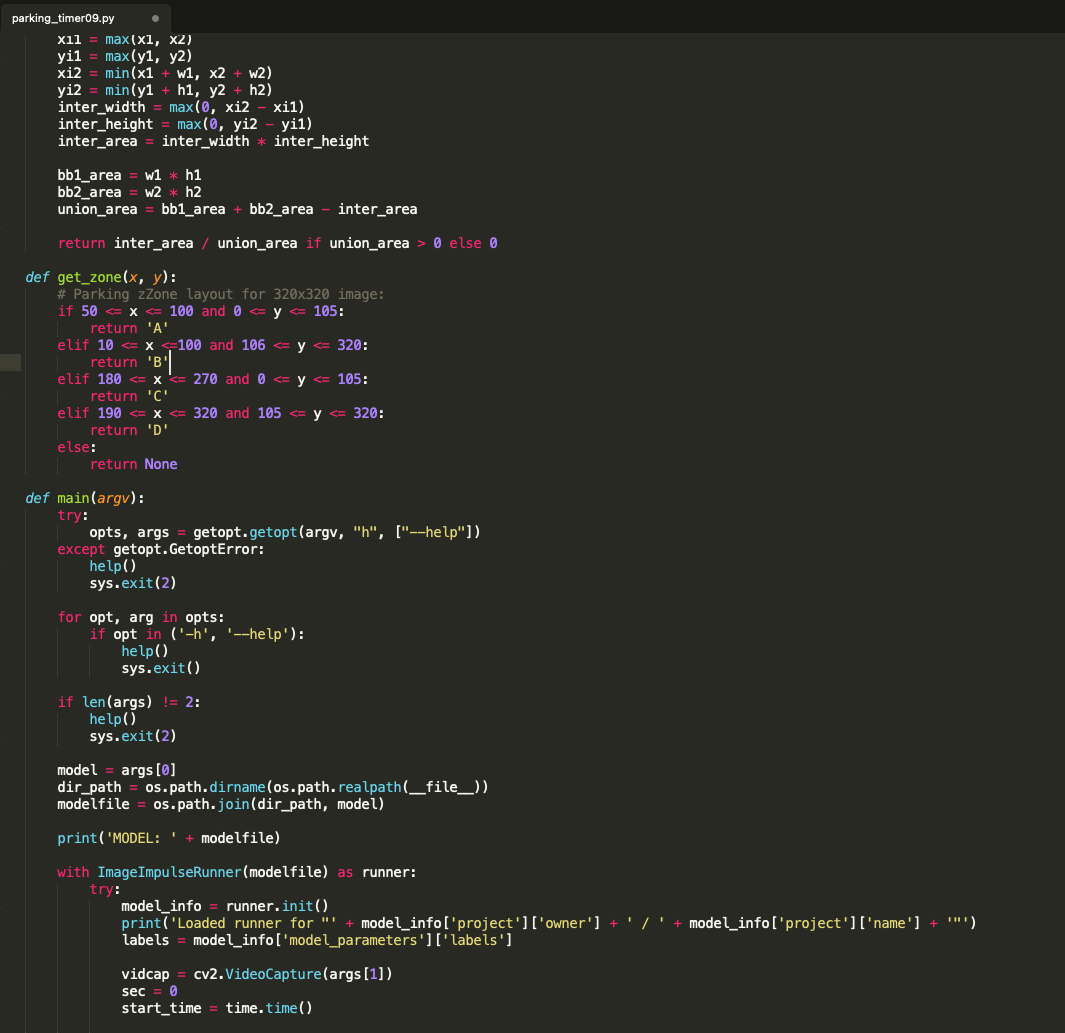 With the impressive accuracy of live inferencing using the Edge Impulse Runner, we can now create a Python-based Parking Meter program. This code performs object tracking and parking duration analysis using bounding boxes detected by our YOLOv5-based model. For every frame, it identifies the location and size of detected cars, then attempts to match them with previously tracked objects using Intersection over Union (IoU), distance between centers, and size similarity. If a match is found, it checks whether the object has moved; if not, it updates the tracked object’s “stopped” duration. If the object has moved or reappeared after more than 3 seconds, it resets the timer. The system only starts displaying bounding boxes if a car has remained stationary for 5 seconds or more, ensuring it is actually parked. Each car is also assigned to one of four parking zones (A, B, C, or D) based on its location. Zone A and B allow parking but turn the bounding box red if the duration exceeds 30 or 100 seconds. Zone C is a no-parking zone and triggers a red box after just 5 seconds. Zone D is a paid parking area where the display shows a dollar amount instead of time, charging $5 every 10 seconds. This zone-based logic allows for flexible rules depending on where the car is parked, and visual feedback is given via color-coded bounding boxes and overlaid text.Note: Minutes are converted to seconds. So that we don’t have to wait for the actual parking time :-)