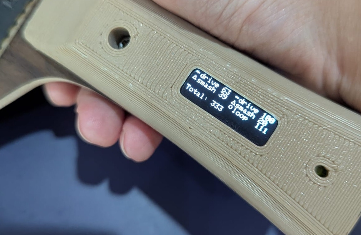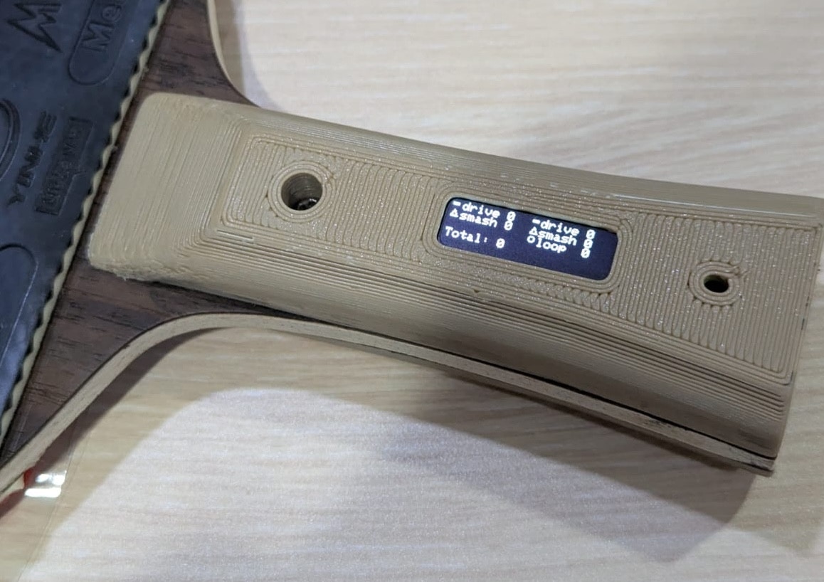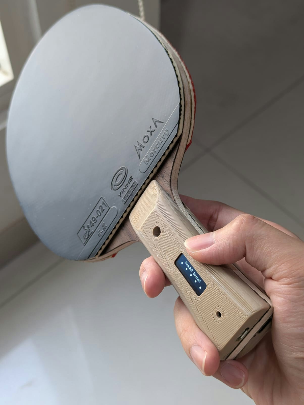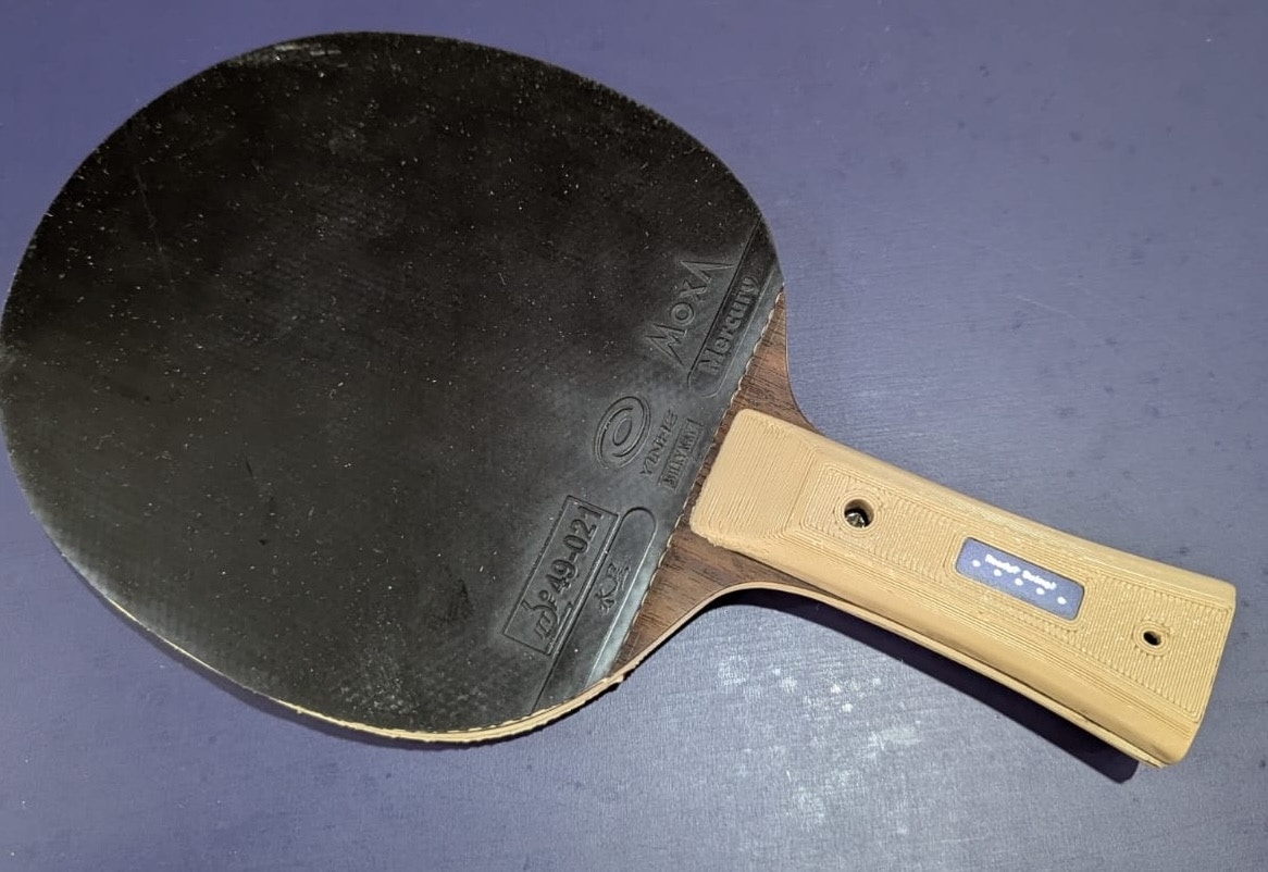 I built a smart table tennis bat by embedding an Arduino Nano 33 BLE Sense Rev2 in a 3D-printed handle, attached to a real blade and rubber. The bat’s BMI270 + BMM150 IMU captures motion data and feeds it to an AI model trained with Edge Impulse Studio.