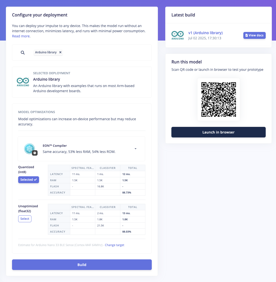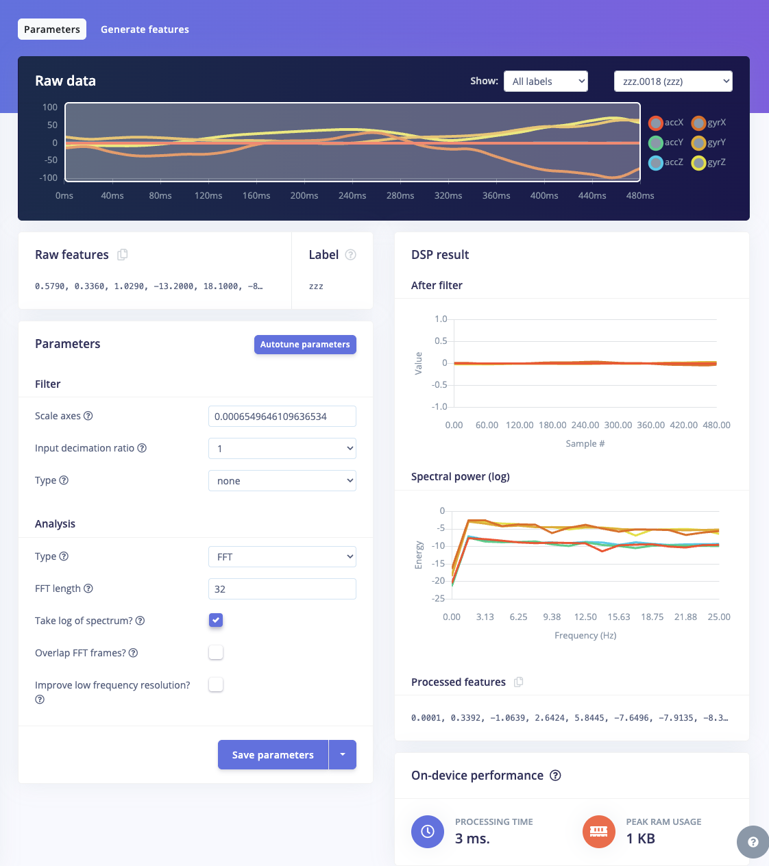 The impulse design transforms raw 6-axis IMU data into stroke classifications through a two-stage pipeline: spectral analysis for feature extraction, followed by neural network classification. Instead of using raw sensor values, we extract frequency domain features that better capture the distinctive motion signatures of different strokes. This approach proves more effective because table tennis strokes have characteristic frequency patterns—drives have different spectral content than loops or smashes.Edge Impulse Configuration:
