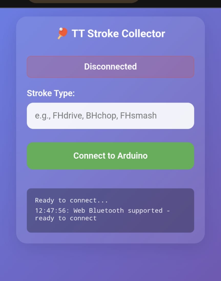 The Arduino runs specialized firmware (table-tennis-data-collection-bluetooth.ino) that handles: