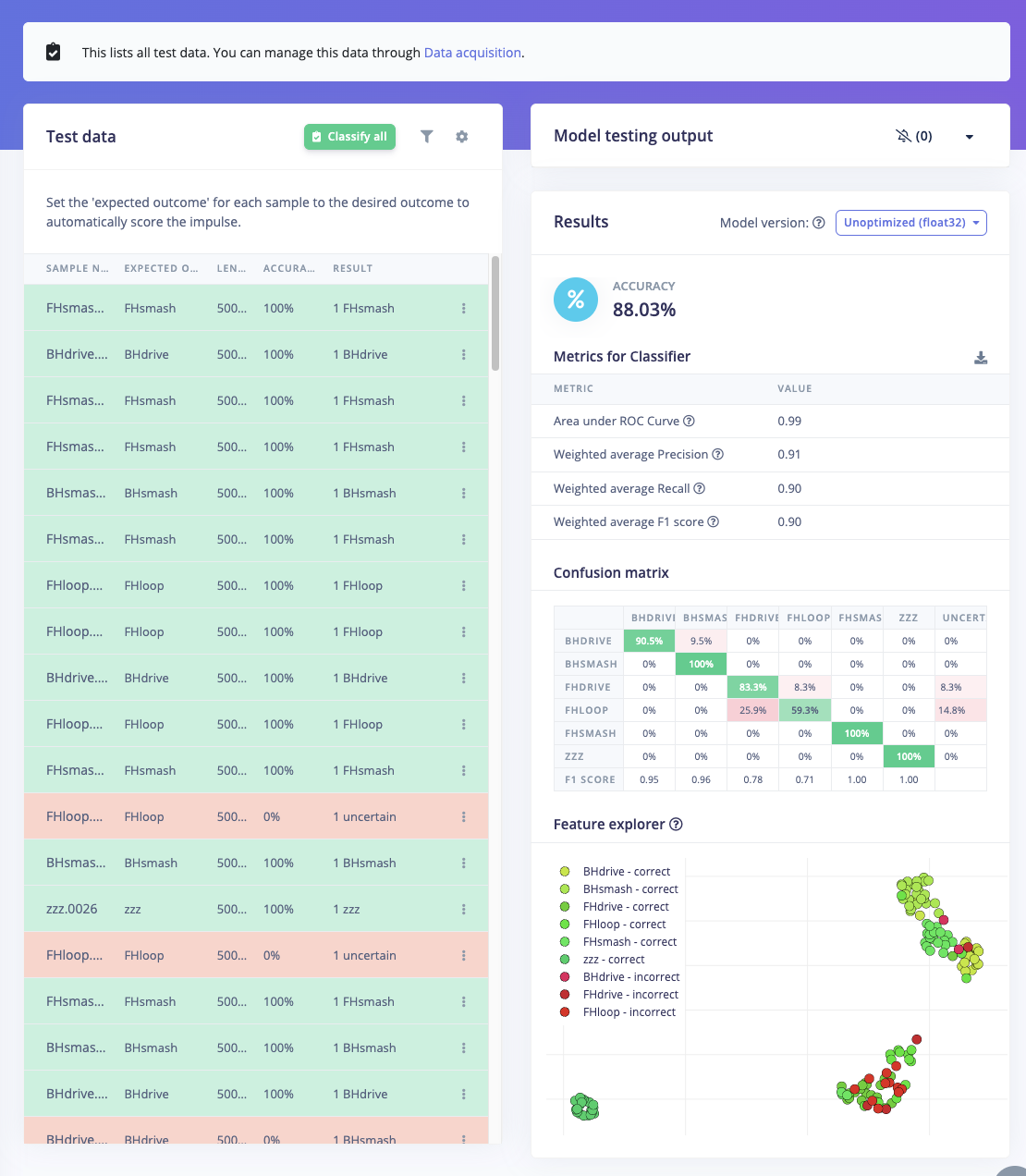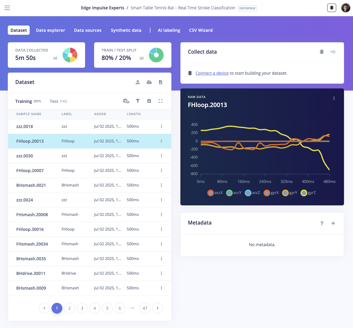 FHdrive0001.csvwill map to theFHdrivelabel). Fix any mislabeled files if needed. - Keep the 80/20 train/test split you recorded, or use Studio’s Split function to create it.