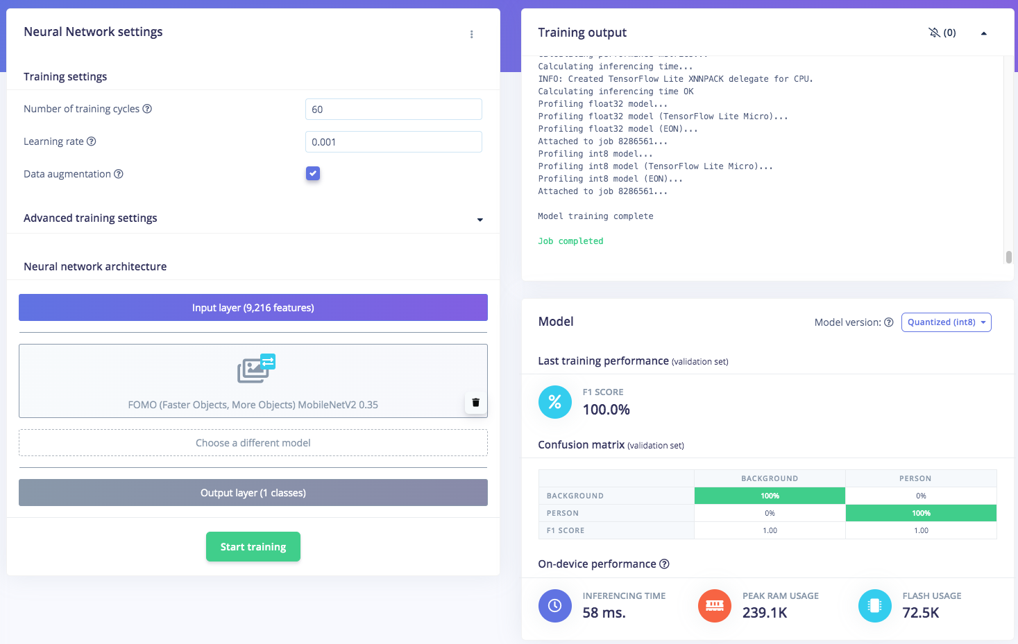 Once you have the dataset ready, go to Create Impulse and set 96 x 96 as the image width - height (this helps in keeping the ML model small). Then choose Fit shortest axis, and choose Image and Object Detection as learning and processing blocks. Go to Image parameter section, select color depth as Grayscale, then press Save parameters. Then click on Generate and navigate to Object Detection section, and leave training settings for the Neural Network as it is — in our case the defaults work quite well, then we choose FOMO (MobileNet V2 0.35). Train the model by pressing the Start training button. You can see the progress on the right side. If everything is OK, then we can test the model. Go to Model Testing on the left, then click Classify all. Our result is above 90%, then we can move on to the next step — deployment.