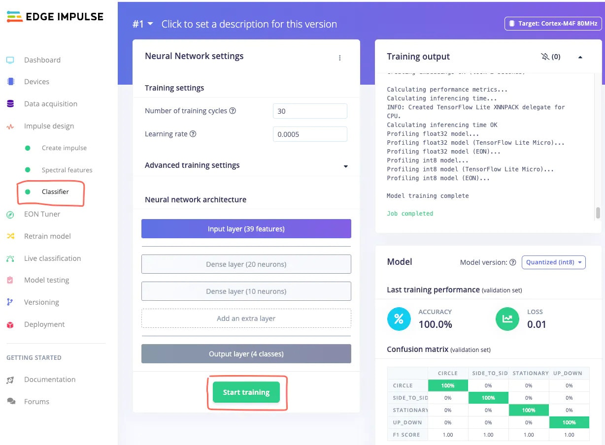 - After feature generation, please navigate to the Learning Tab (Classifier in this case) to design the neural network architecture. I have used the default architecture and parameters recommended by the Edge Impulse Studio. After selecting a suitable configuration, click on the Start training button.