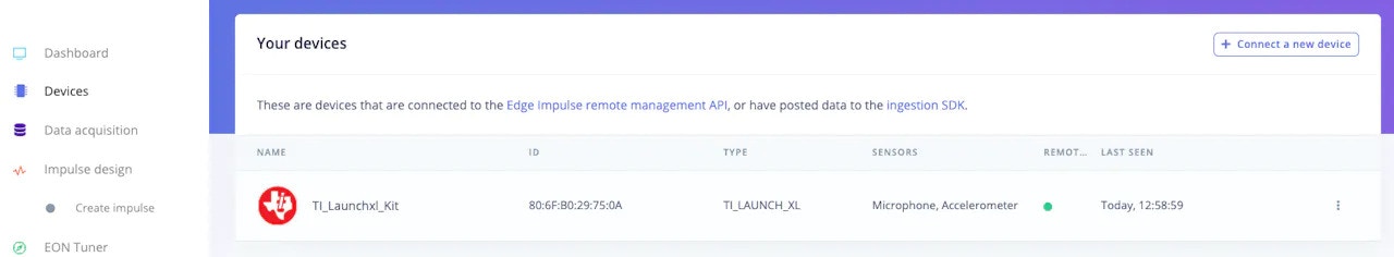 edge-impulse-daemonwill tell you which project the board is connected to. We can also verify by checking the devices tab of that project.