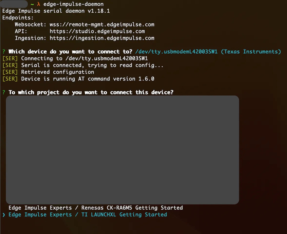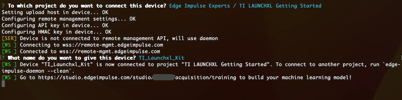 The next step is connecting our TI LAUNCHXL board to the Edge Impulse Studio, so we can ingest sensor data for the machine learning model. Please follow the below steps to do so:- Open a terminal or command prompt and type