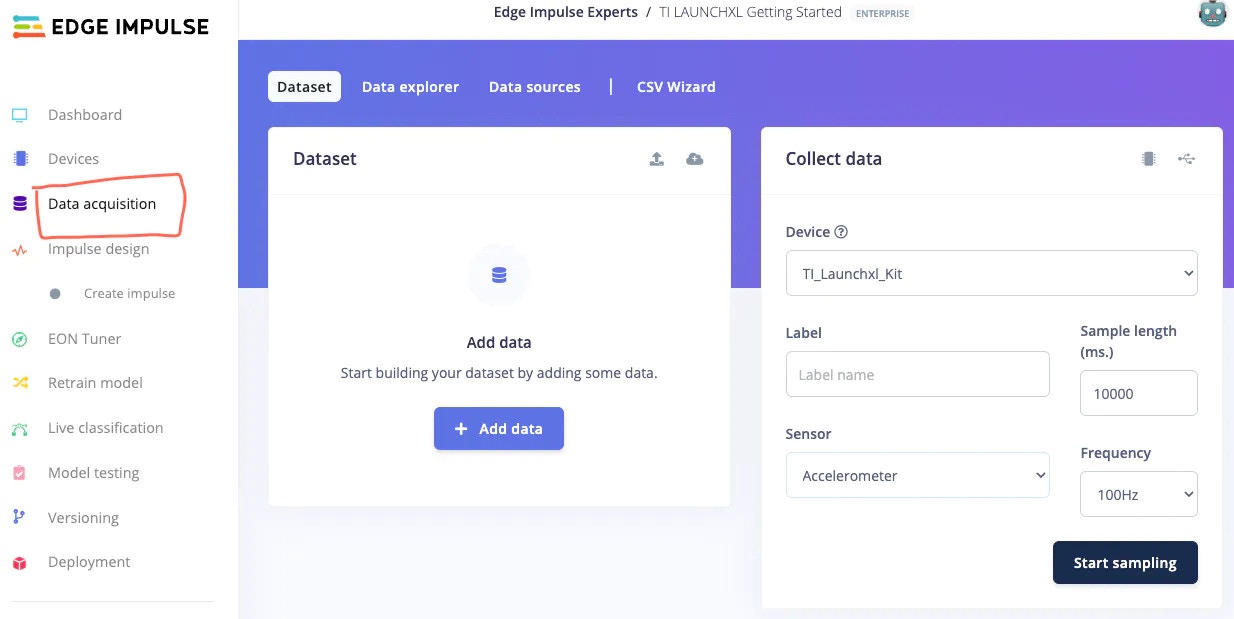 - Navigate to the Data Acquisition tab in the Edge Impulse Studio.