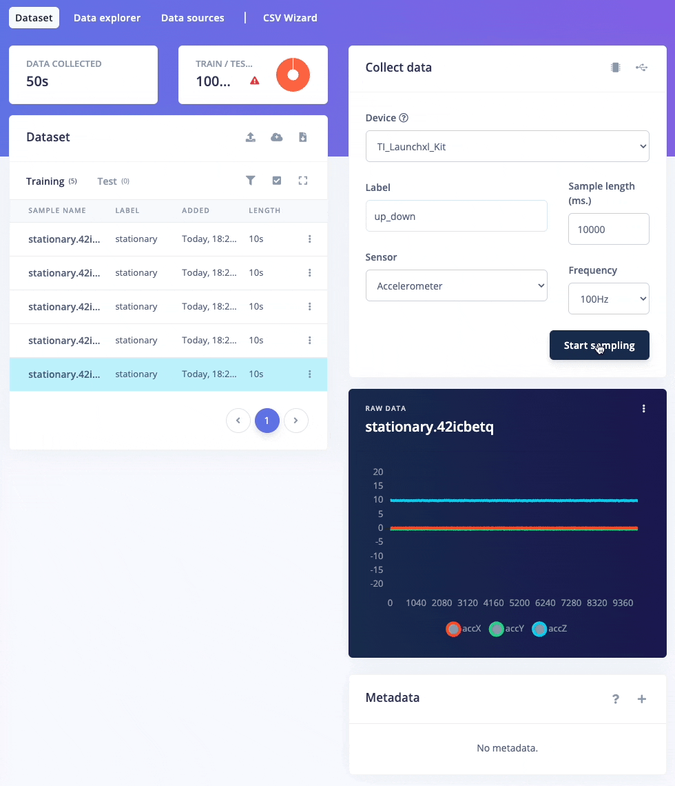 - Clicking Start Sampling will start the sample collection process. Once the sample is collected, it will be automatically uploaded to the Edge Impulse Studio.
