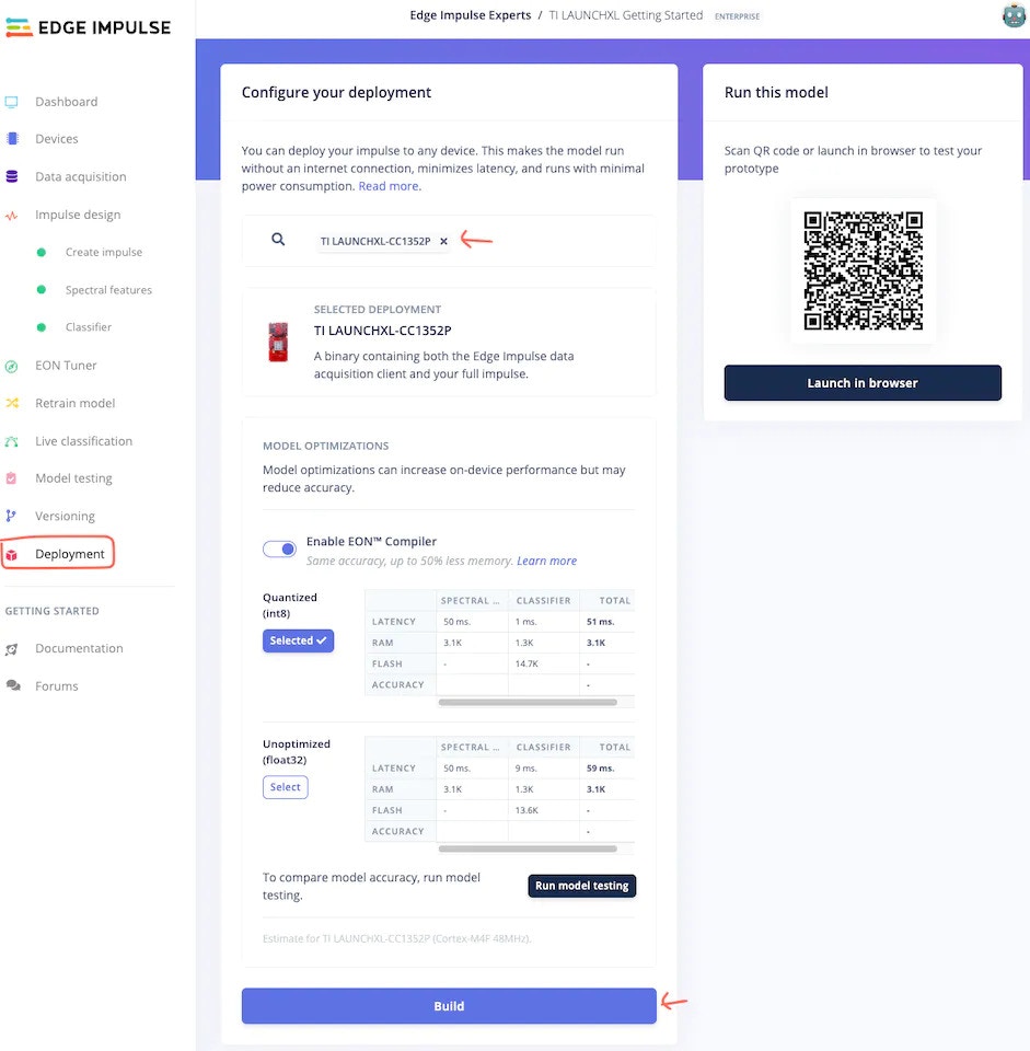 In this step, we will deploy our prepared model to the TI LAUNCHXL-CC1352P development board, so we can perform inference locally on the board.- Please navigate to the Deployment tab, select the TI LAUNCHXL-CC1352P board using the search bar, and click on the Build button.