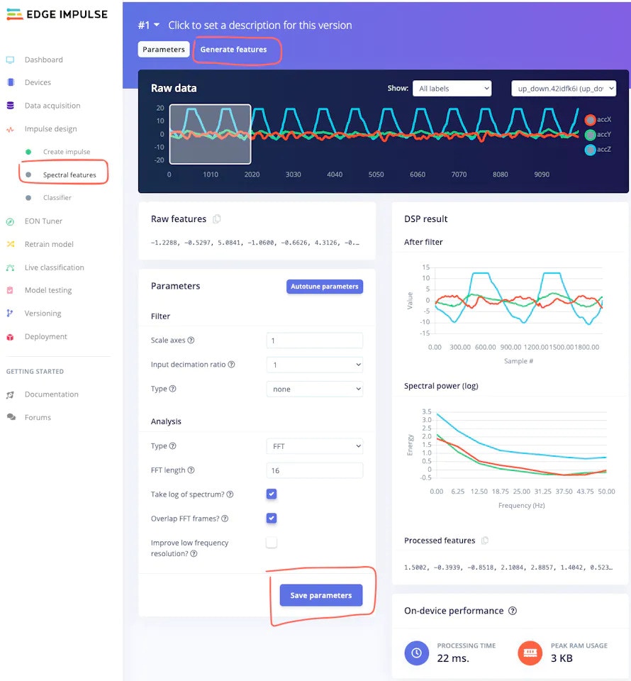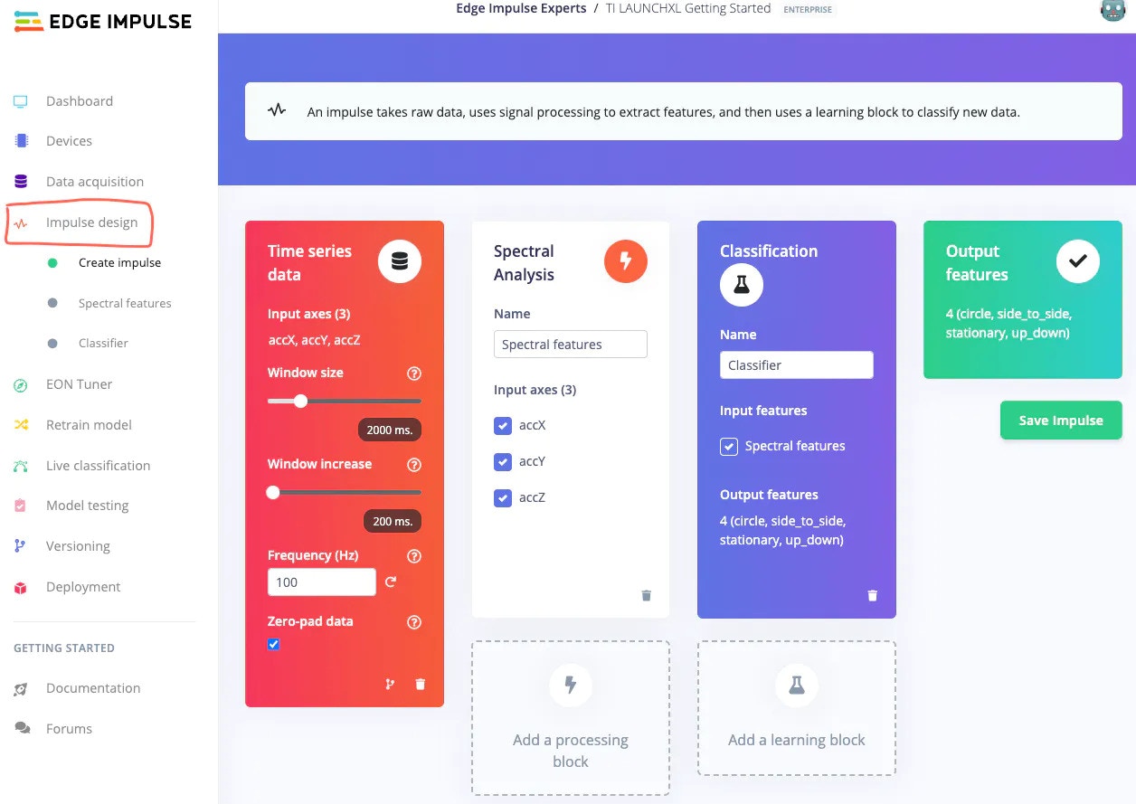 - After Impulse design is complete, save the design and navigate to the preprocessing tab (Spectral features in this case) for the feature generation.