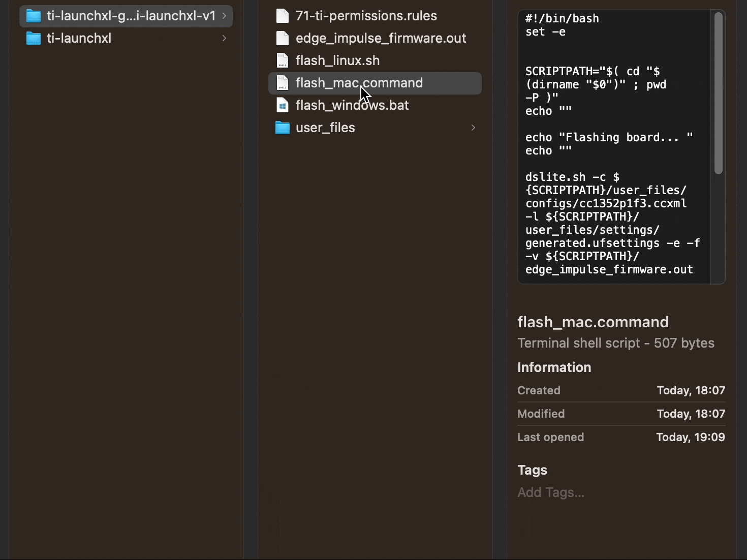 flash_<operating-system>file. This will flash the newly created firmware on the TI LAUNCHXL-CC1352P board. This firmware contains the machine learning model we prepared in the above steps.