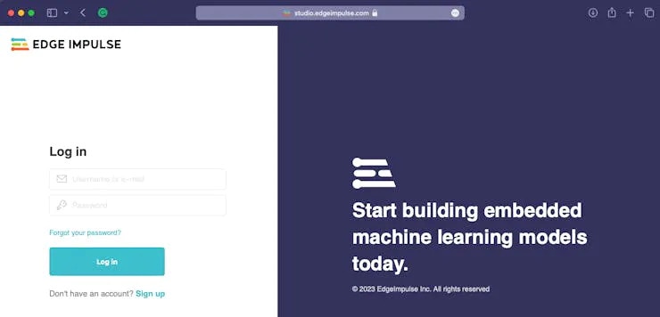 To begin, you’ll need to create an Edge Impulse account and a project in the Edge Impulse Studio. Please follow the below steps to do so:- Navigate to the Edge Impulse Studio and create an account. If you already have an account then please login using your credentials.