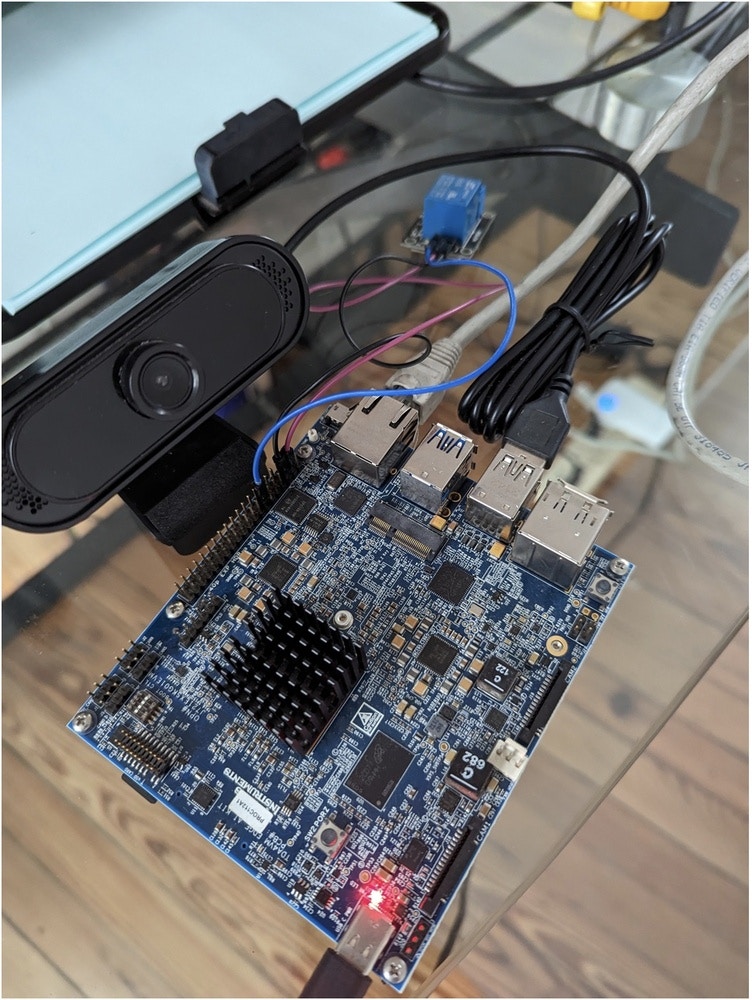 I have connected the Logitech USB camera to the first USB port, the Power Supply to the back USB-C connector (the other one is for UART over USB) and I still had to connect the 1-channel Relay that will be used to provide power to the theoretical machine being operated.