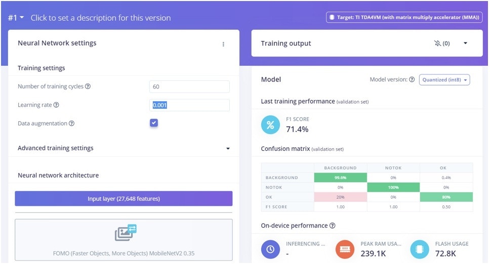 - I went to Object Detection and I have configured 60 Training cycles, 0.001 Learning rate, Data augmentation and FOMO (Faster Objects More Objects) model.