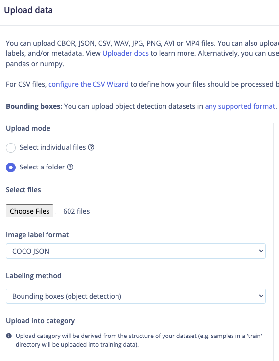 In the initial stage of building a model in Edge Impulse Studio, we need to prepare the data, which can be in the form of images or videos that will later be split into images. The image and video data can be sourced from free-license databases such as the COCO dataset or Roboflow, which can then be used for object detection training. Alternatively, you can collect your own data to better suit the purposes of your project. Here, I will provide an example of how to upload data in Edge Impulse Studio for both scenarios (see the images below). For those who are not familiar with Edge Impulse Studio, simply visit https://studio.edgeimpulse.com, login or create an account, then create a new Project. Choose Images when given a choice of project type, then Object detection. In Dashboard > Project Info, choose Bounding Boxes for the labeling method and NVIDIA Jetson Orin Nano for the target device. Then move to Data acquisition (on the left hand navigation menu), and click on the Upload Data tab.Note: When collecting data samples, it’s important to remember that the images of vehicles (trucks or cars) to be labeled should not be too small, as the model we’re building can only recognize objects with a minimum size of 32x32 pixels.