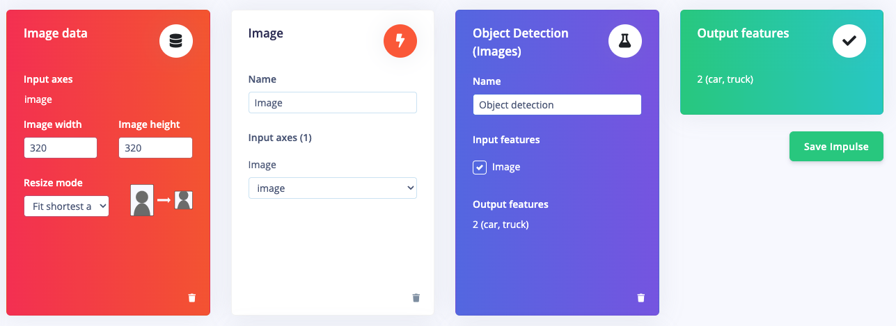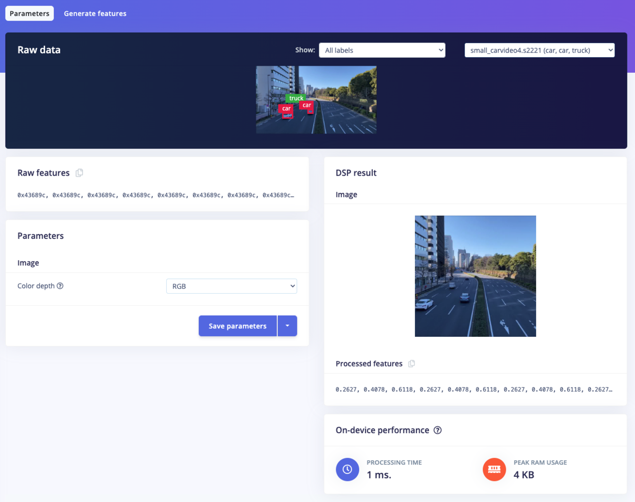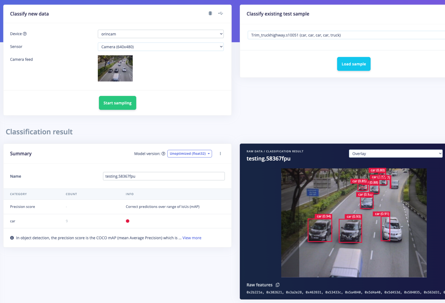 Once your labelled dataset is ready, go to Impulse Design > Create Impulse, and set the image width and height to 320x320. Choose Fit shortest axis, then select Image and Object Detection as the Learning and Processing blocks, and click Save Impulse. Next, navigate to the Image Parameters section, select RGB as the color depth, and press Save parameters. After that, click on Generate, where you’ll be able to see a graphical distribution of the two classes (car and truck). Now, move to the Object Detection navigation on the left, and configure the training settings. Select GPU as the compute option and MobileNet v2 (3x224x224) as the backbone option. Set the training cycles to around 400 and the minimum learning rate to 0.000005. Choose NVIDIA TAO YOLOv4 as the neural network architecture — for higher resolutions (eg. 640x640), you can try YOLOv5 (Community blocks) with a model size of medium (YOLOv5m) — Once done, start training by pressing Start training, and monitor the progress. If everything goes well and the precision result is around 80%, proceed to the next step. Go to the Model Testing section, click Classify all, and if the result is around 90%, you can move on to the final step — Deployment.