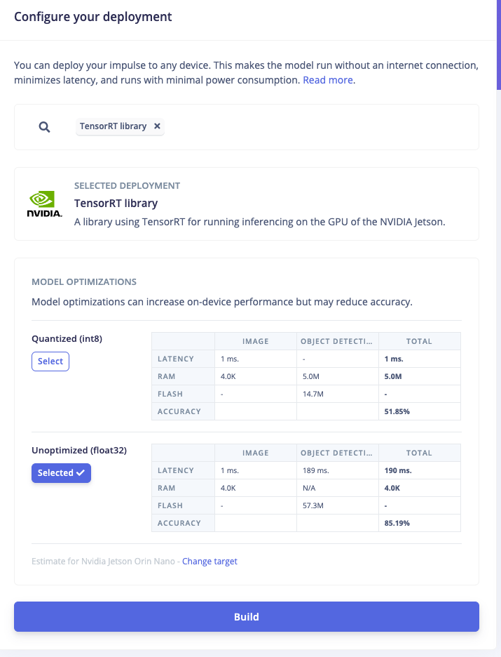 Click on the Deployment tab, then search for TensorRT, select (Unoptimized) Float32, and click Build. This will generate the NVIDIA TensorRT library for running inference on the Orin Nano’s GPU. Once downloaded, unzip the file, and you’ll be ready to deploy the model using the Edge Impulse SDK on to the NVIDIA Jetson Orin Nano. Alternatively, there’s an easier method: simply ensure that the model has been built in Edge Impulse Studio. From there, you can test, download the model, and run everything directly from the Orin Nano.