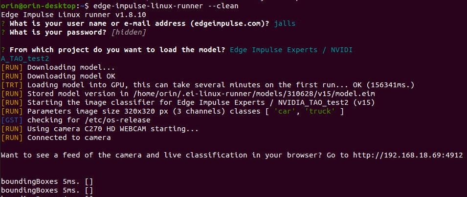 Open a terminal on the Orin Nano or ssh from your PC/laptop then runedge-impulse-linux-runner --clean, which will allow you to select your project. Log in to your account and choose your project. This process will download the model.eim file, which is specifically built with the TensorRT library targeting the Orin Nano GPU. During the process, the console will display the path where the model.eim has been downloaded. For example, in the image below, it shows the file located at /home/orin/.ei-linux-runner/models/310628/v15.