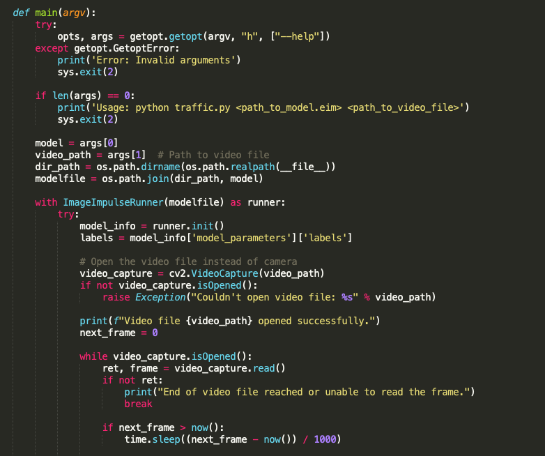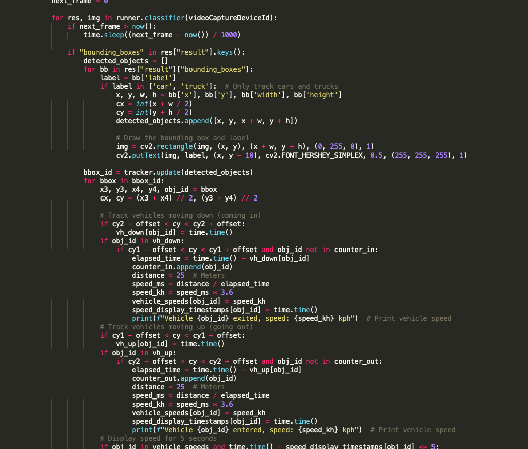 With the impressive performance of live inferencing using the Linux Runner, we can now create a Python-based Traffic Analysis program to calculate cumulative counts, and track the direction and speed of vehicles. This program is a modification of theClassify.py script from Edge Impulse’s examples in the linux-python-sdk directory. We have adapted it into an object tracking program by integrating a tracking library, which identifies whether the moving object is the same vehicle or a different one by assigning different IDs. This prevents miscounts or double counts.