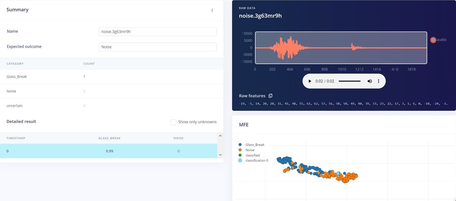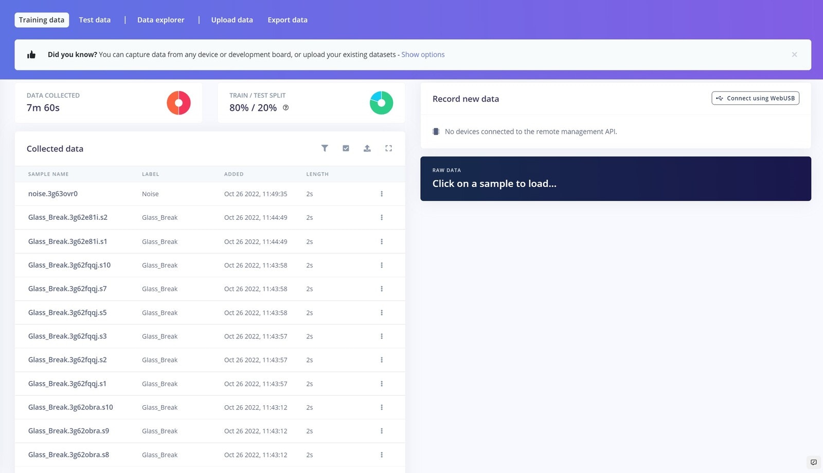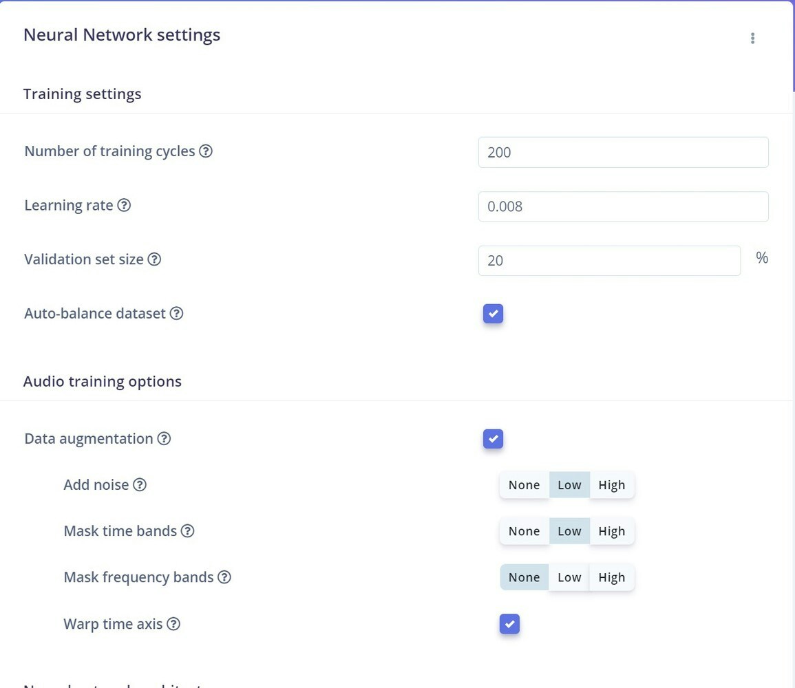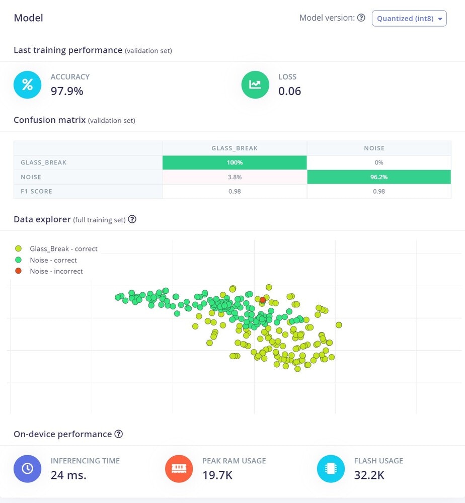 One of the most important parts of any machine learning model is its dataset. Edge Impulse offers us two options to create our dataset: either direct uploading of files, or recording data from actual the device itself. For this project we chose to record data with the device itself, because as a prototype, the data will be limited. A second reason to record data with the device itself is that it can improve accuracy. To get started connecting the Nano 33 BLE Sense to Edge Impulse, you can have a look at this tutorial. In this scenario, we have only two classes Glass Break, and Noise. Glass breaking sounds that we have used are from the vivid online resources and the major noise datasets are from the Microsoft Scalable Noisy Speech Dataset (MS-SNSD). We also included the natural noise in the room, apart from the MS-SNSD data. The sound recording was done for 20 seconds at a 16KHz sampling rate. Something to keep in mind is that you must keep the sampling rate the same between your training dataset and your deployment device. If you are training with 44.1Khz sound, you need to downsample it to 16KHz when you are ready to deploy to the Arduino. We collected around 10 minutes of data and split it between Training and a Test set. In the Training data we split the samples to 2s, otherwise the inferencing will fail because the BLE Sense has a limited amount of memory to handle the data.