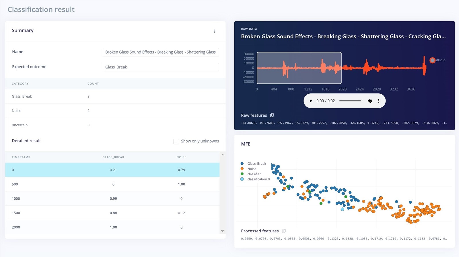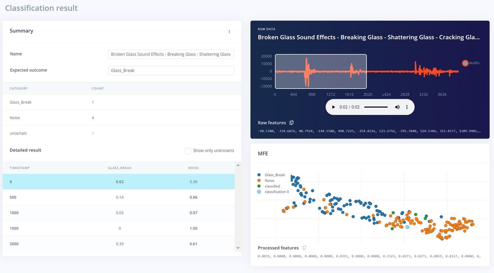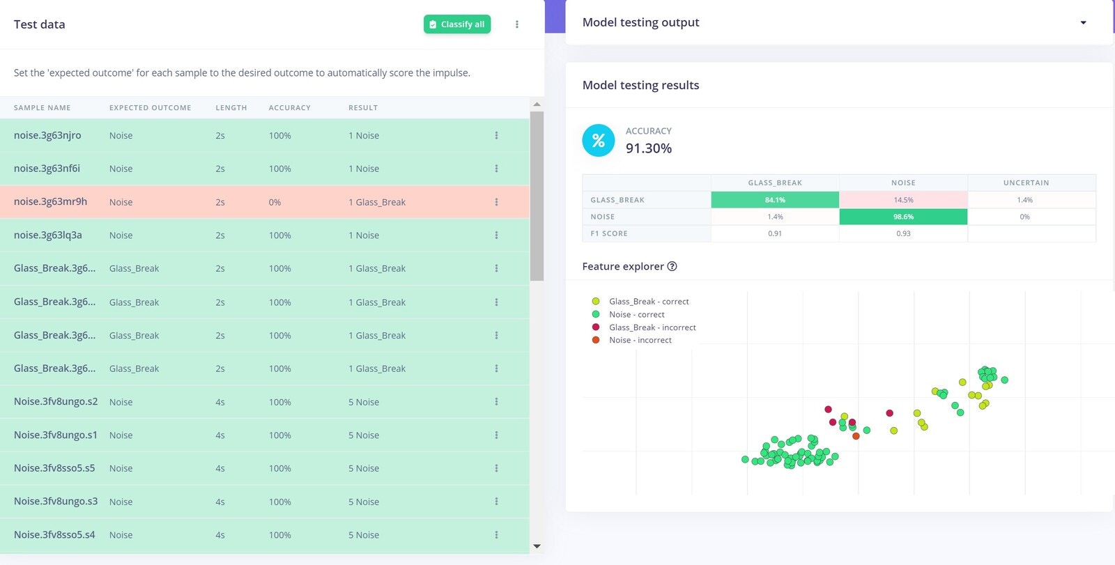 One of the most important parts of any machine learning model is its dataset. Edge Impulse offers us two options to create our dataset: either direct uploading of files, or recording data from actual the device itself. For this project we chose to record data with the device itself, because as a prototype, the data will be limited. A second reason to record data with the device itself is that it can improve accuracy. To get started connecting the Nano 33 BLE Sense to Edge Impulse, you can have a look at this tutorial. In this scenario, we have only two classes Glass Break, and Noise. Glass breaking sounds that we have used are from the vivid online resources and the major noise datasets are from the Microsoft Scalable Noisy Speech Dataset (MS-SNSD). We also included the natural noise in the room, apart from the MS-SNSD data. The sound recording was done for 20 seconds at a 16KHz sampling rate. Something to keep in mind is that you must keep the sampling rate the same between your training dataset and your deployment device. If you are training with 44.1Khz sound, you need to downsample it to 16KHz when you are ready to deploy to the Arduino. We collected around 10 minutes of data and split it between Training and a Test set. In the Training data we split the samples to 2s, otherwise the inferencing will fail because the BLE Sense has a limited amount of memory to handle the data.
