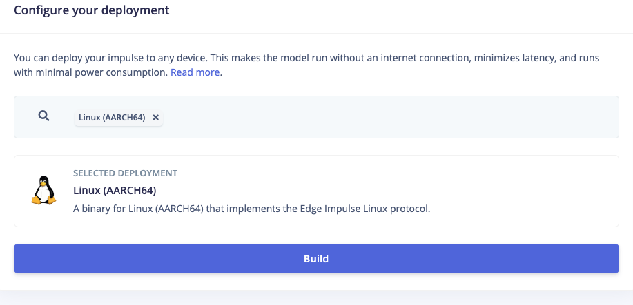 The anomaly scoring algorithm can be neatly packaged into an Edge Impulse .eim file. To do so go to the Deployment tab of the second Edge Impulse project (the one with the k-mean anomaly scoring) and select Linux (AARCH64) from the drop down menu and click Build. Once the file is presented, download it to your machine and then drag and drop into the brainchip_accelerometer folder in the open Visual Studio Code file viewer.