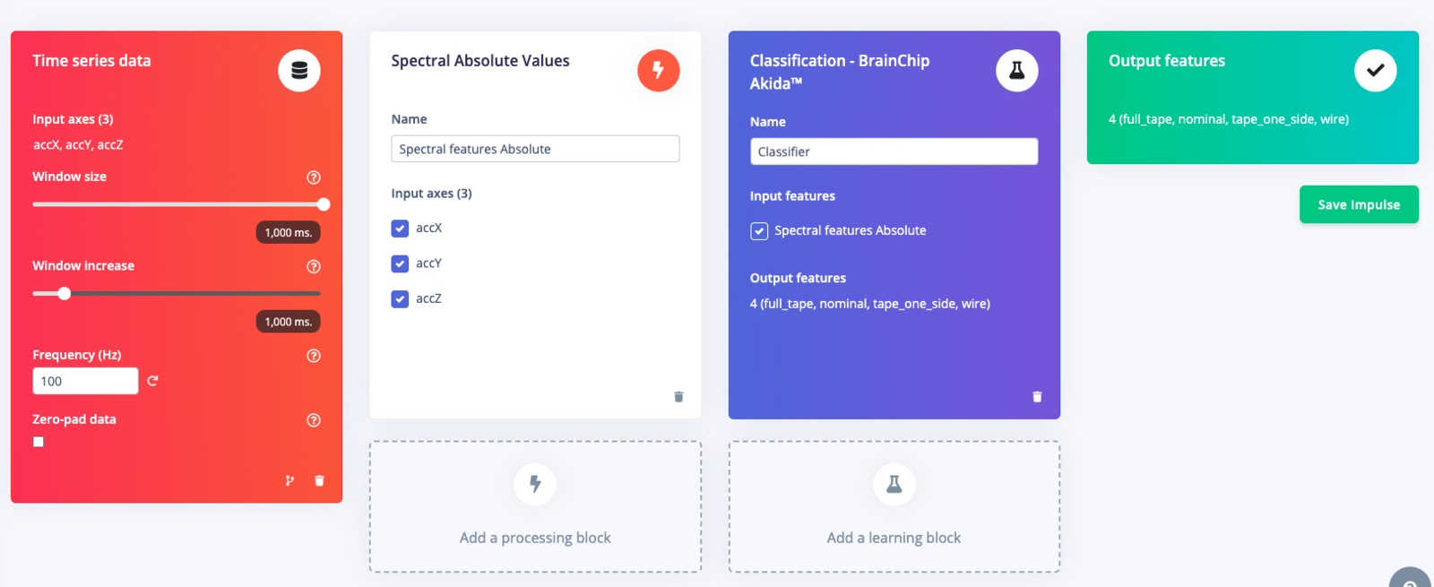 Since you have taken accelerometer data at 100Hz for 1-second record lengths it is important to use those values in the Timing series data block.Processing Block: Custom Spectral Features