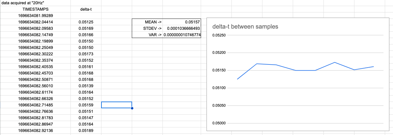 The Ubuntu operating system running on Raspberry Pi is not an RTOS and so it is impossible to get consistently spaced accelerometer samples. That is, the data acquisition is not hardware timed as the OS has to be interrupted to service the sampling and it can be delayed by other tasks. Therefore there is no guarantee that samples are acquired at a fixed delta-t. In order to get good performance the code implements a hardware interrupt with the PWM and GPIO pins. Our testing showed that the maximum delay in servicing the interrupt went from approximately 8ms to 2ms. The codemake an assumption that the delta-t is fixed at the sample frequency and no variance is recorded.