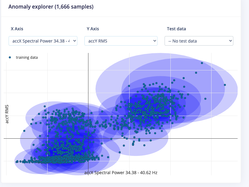 Anomaly detection can be used to detect irregular patterns in the collected sensor data. In Edge Impulse you can implement anomaly detection using one of the available anomaly detection blocks. For this setup you will be using k-means as it is freely available to all Edge Impulse developers. In the anomaly detection block, make sure to click the “Select Suggested Axes” to highlight the features of importance . Without selecting this button, the anomaly detection settings will default to your data’s Root-Mean-Square value (or RMS) for each of the axes. Prior to the release of the feature importance view in the DSP block, the anomaly detection block would prioritize the RMS values, and you would then have to make a decision by yourself if the RMS values were most meaningful for your anomaly detection use case. With feature importance, you take the guesswork out of this and get your model to production even faster!