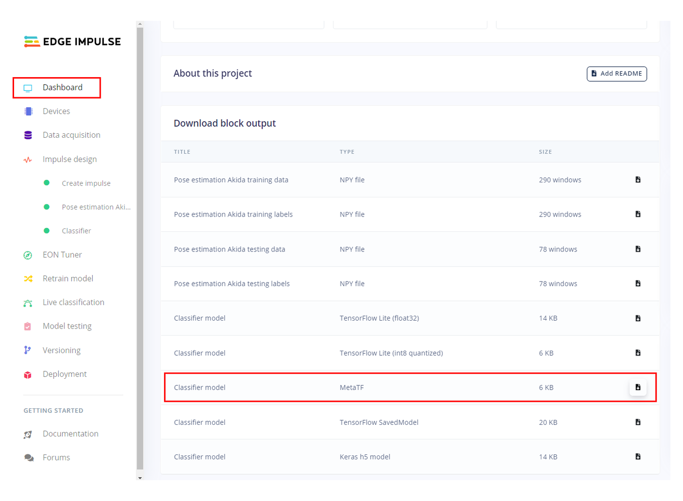You are using custom code for this project and you will need the Akida compatible model file stored in FBZ format. Proceed to the dashboard of the first project (the classifier project) and select the Classifier model - MetaTF file. Once the file is presented download to your machine and then drag and drop into the brainchip_accelerometer folder in the open Visual Studio Code file viewer.