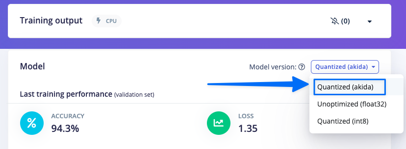 When using the Akida blocks it is important to review the accuracy of the model. Akida heavily quantizes the model and without proper training (especially quantization ware training). The Akida Learning Blocks have this training code implemented and the defaults can work really well with this type of data. To view the model accuracy and Akida specific metrics be sure to select the “Quantized (akida)” as the model version.