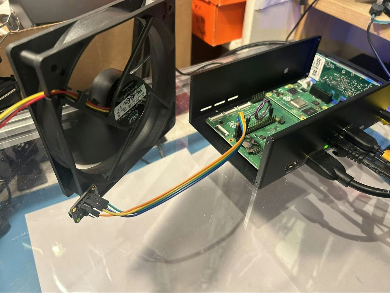 - Standoffs and screws — used are a #2-52 screw/nut to secure to fan