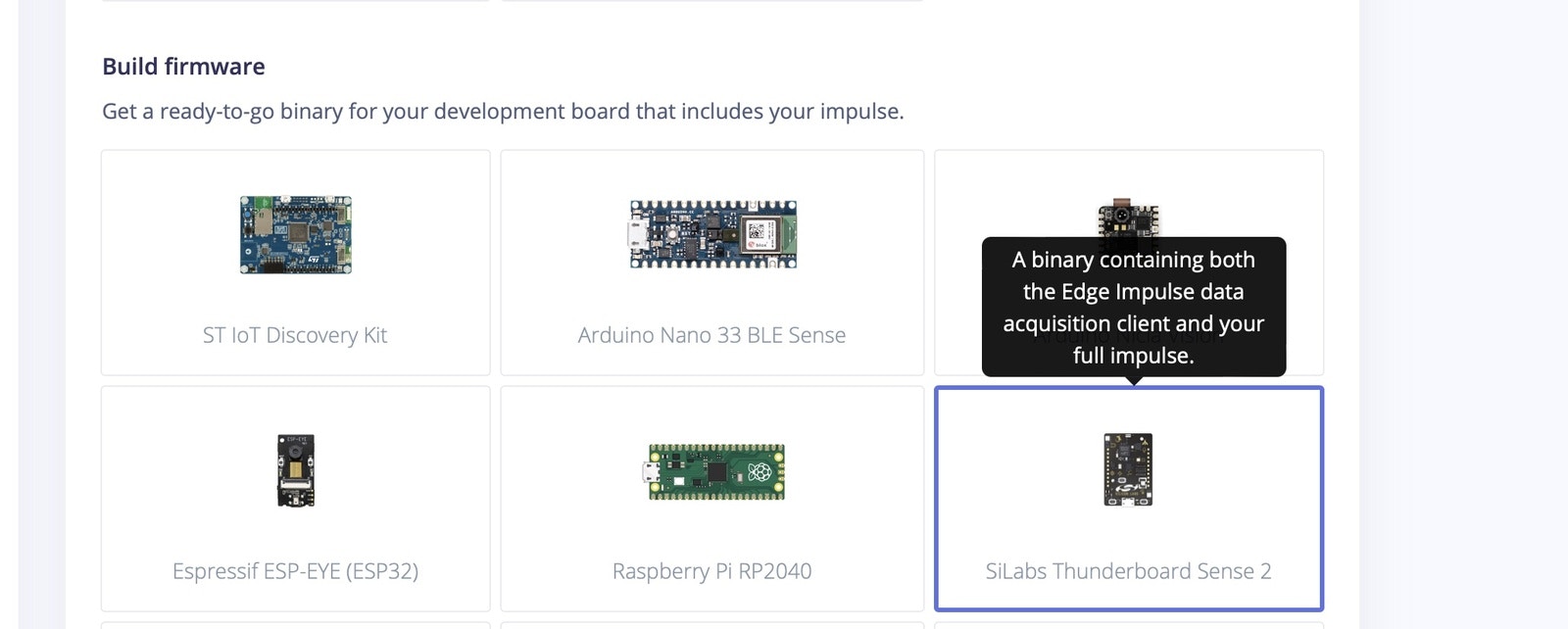 Go to the Deployment section, and select Firmware option “Thunderboard Sense 2”. This will generate and download the firmware to your local system.