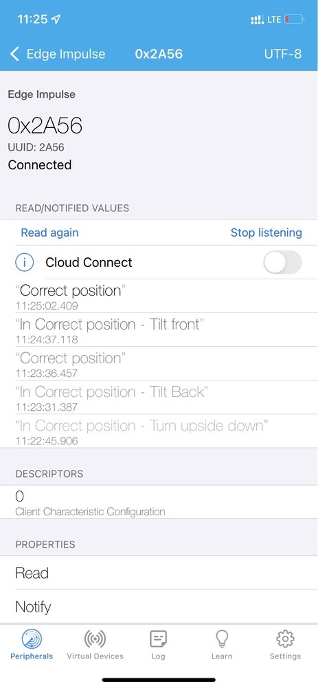 To test it out in a real scenario, download the “LightBlue” app from the iOS App Store or Google Play store. This app will be used to communicate to with the Thunderboard Sense 2. Open the App and connect to the Edge Impulse service (Make sure board is powered on). Input settings in the application:- Subscribe to the