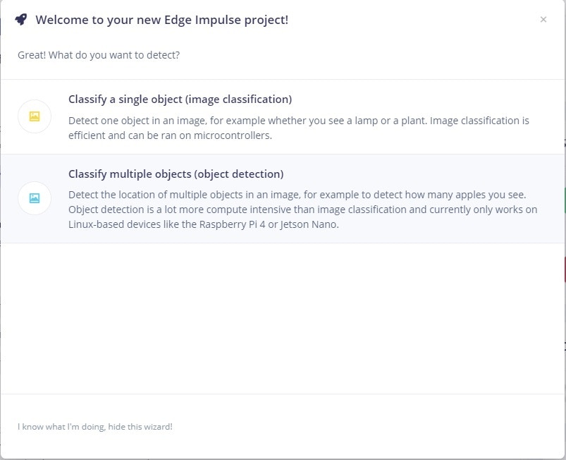 The first step towards building your TinyML Model is creating a new Edge Impulse Project. Once logged in to your Edge Impulse account, you will be greeted by the Project Creation screen.